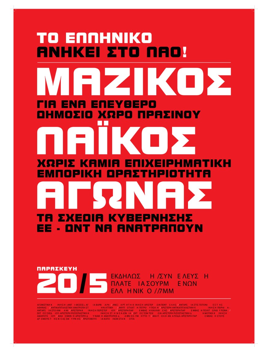 Με τα μνημόνια και το νέο «σύμφωνο ανταγωνιστικότητας» της Ευρωπαϊκής Ένωσης, τα δικαιώματα και οι κατακτήσεις των εργαζόμενων και του λαού βρίσκονται καθημερινά στο απόσπασμα προς όφελος των συμφερόντων του κεφαλαίου. Παράλληλα επιδιώκεται το ξεπούλημα κάθε είδους δημόσιας περιουσίας, είτε πρόκειται για την επιτάχυνση του προγράμματος ιδιωτικοποιήσεων των ΔΕΚΟ, είτε για το ξεπούλημα της δημόσιας γης με το fast track, αναπόσπαστο κομμάτι του Μνημονίου. Στο πλαίσιο αυτό, το πρώην αεροδρόμιο του Ελληνικού και άλλοι πολύτιμοι χώροι για του κατοίκους της Αθήνας μπαίνουν στο στόχαστρο, όπως το παραλιακό μέτωπο του Σαρωνικού, τα Μπαρουτάδικα στο Αιγάλεω, οι «αναξιοποίητες ολυμπιακές εγκαταστάσεις», ο χώρος της ΠΥΡΚΑΛ σε Δάφνη – Υμμητό καθώς και δεκάδες περιοχές ανά την Ελλάδα που κινδυνεύουν να αποδοθούν σε κάθε είδους τουριστική και κατασκευαστική «αξιοποίηση».