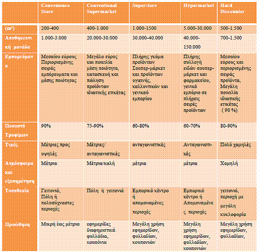 -τα «discount stores», διαθέτουν προϊόντα ιδιωτικής ετικέτας ή και άλλων, σε περιορισμένη ποικιλία και πολύ φτηνά