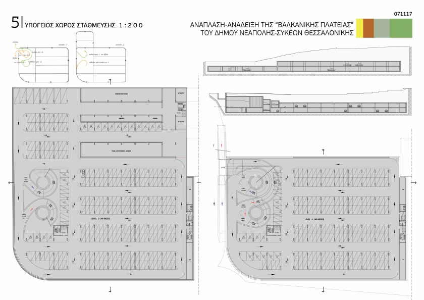 Η εσωτερική κυκλοφορία στα επίπεδα έχει απλοποιηθεί μέσα από τη διαμόρφωση αριστερόστροφης περιμετρικής πορείας (με σκοπό την επιλογή στοίχου στάθμευσης) και με αμφίδρομης κατεύθυνσης διαδρόμους ανάμεσα στους στοίχους στάθμευσης για την αποφυγή εκτεταμένων περιπορειών. Τα δύο υπόγεια στάθμευσης αριθμούν συνολικά 431 θέσεις ΙΧ, 38 θέσεις για ΑΜΕΑ και 8 θέσεις για μικρά οχήματα τροφοδοσίας. Το σύνολο των θέσεων είναι εφικτό να αυξηθεί σε επόμενο στάδιο μελέτης (με αύξηση της επιφάνειας των ορόφων ή με προσθήκη υπόγειων επιπέδων) εφόσον κάτι τέτοιο θεωρηθεί σκόπιμο από την υπηρεσία. Το ελεύθερο ύψος των επιπέδων στάθμευσης ορίστηκε στα 2,50 μ για τη διασφάλιση καθαρού ύψους κυκλοφορίας οχημάτων 2,20 και της αναγκαίας αναμονής για τη διέλευση αγωγών εξαερισμού και την ανάρτηση πινακίδων σήμανσης. Όλες οι υπόλοιπες διαστάσεις του γεωμετρικού σχεδιασμού είναι σύμφωνες με την ελληνική νομοθεσία σχεδιασμού υπόγειων χώρων στάθμευσης (ΠΔ 455/76 με τις μετέπειτα τροποποιήσεις του).