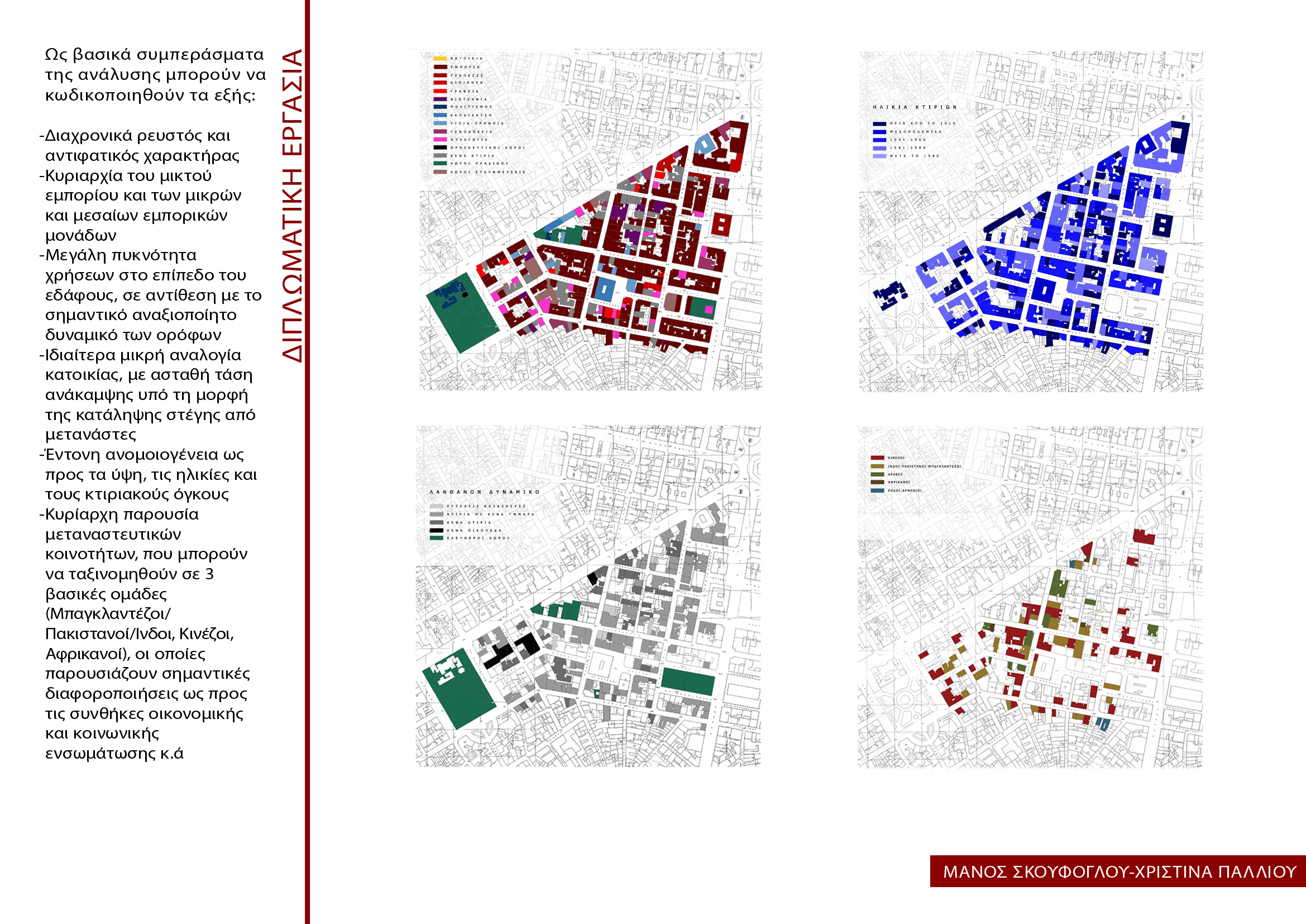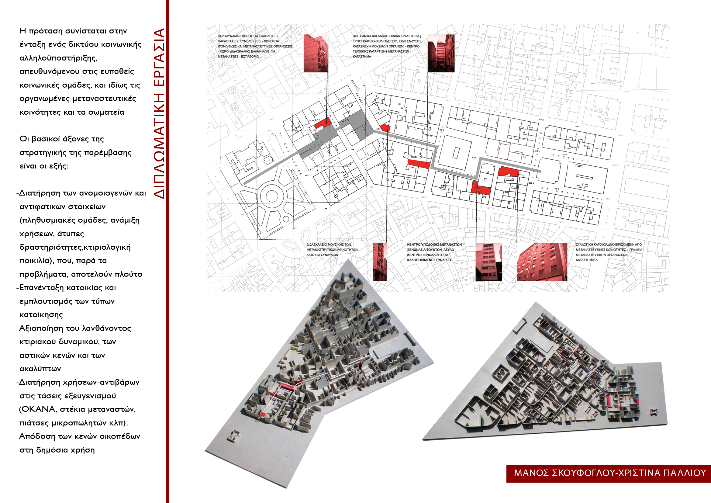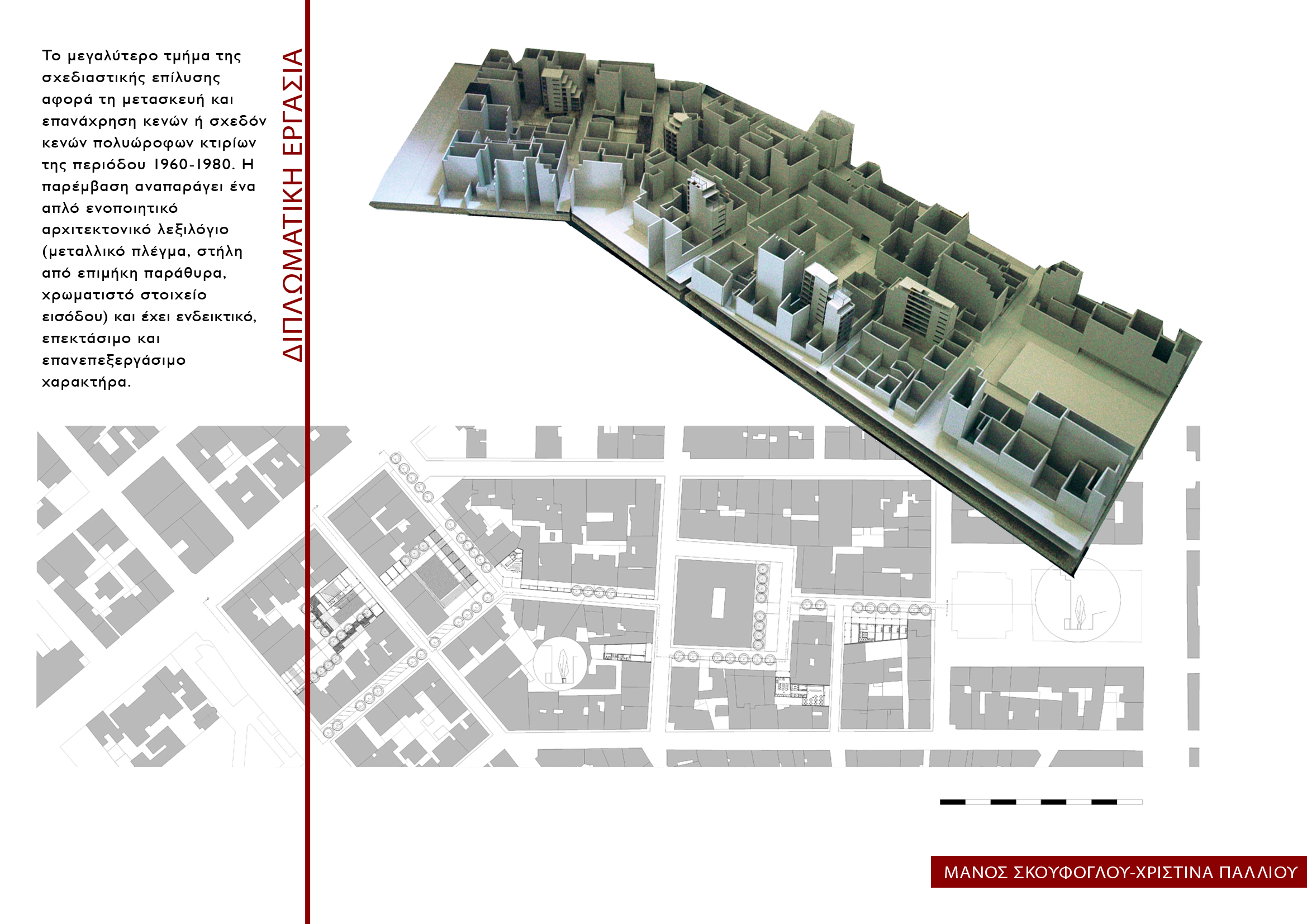 Η διπλωματική εργασία που δημοσιεύουμε εδώ παρουσιάστηκε από τους Μάνο Σκούφογλου και Χριστίνα Πάλλιου στην Αρχιτεκτονική ΕΜΠ τον Ιούλιο του 2008 με επιβλέπουσες τις καθηγήτριες Θεανώ Φωτίου και Μαρία Μαντουβάλου. Το πεδίο της διερεύνησης στην καρδιά του κέντρου της Αθήνας, ορίζεται από το τρίγωνο των οδών Ευριπίδου, Αθηνάς και Πειραιώς. Η συγκεκριμένη περιοχή, ανάμεσα στο Μεταξουργείο και το Ψυρρή, δεν έχει υποστεί κανενός είδους εξευγενισμό, φιλοξενεί πολλούς μετανάστες και θεωρείται «υποβαθμισμένη». Χαρακτηρίζεται από ανομοιογένεια, μικρή αναλογικά χρήση κατοικίας, πολλές (και άτυπες) εμπορικές δραστηριότητες και σημαντικά αστικά κενά: ενώ τα ισόγεια των κτιρίων και ο παρακείμενος δημόσιος χώρος χαρακτηρίζονται από έντονη πυκνότητα χρήσεων, οι όροφοι των κτιρίων έχουν σε κάποιο βαθμό εγκαταλειφθεί.