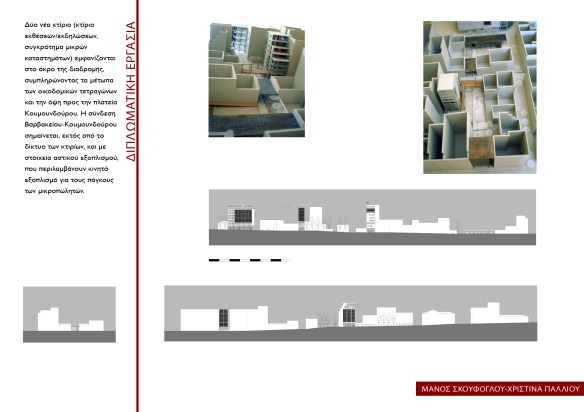 Δύο νέα κτίρια (κτίριο εκθέσεων/εκδηλώσεων και συγκρότημα μικρών καταστημάτων) εμφανίζονται στο άκρο της διαδρομής, συμπληρώνοντας τα μέτωπα των οικοδομικών τετραγώνων και την όψη προς την πλατεία Κουμουνδούρου. Η σύνδεση Βαρβακείου – Κουμουνδούρου σημαίνεται, εκτός από το δίκτυο των κτιρίων, και με στοιχεία αστικού εξοπλισμού, που περιλαμβάνουν κινητό εξοπλισμό για τους πάγκους των μικροπωλητών.