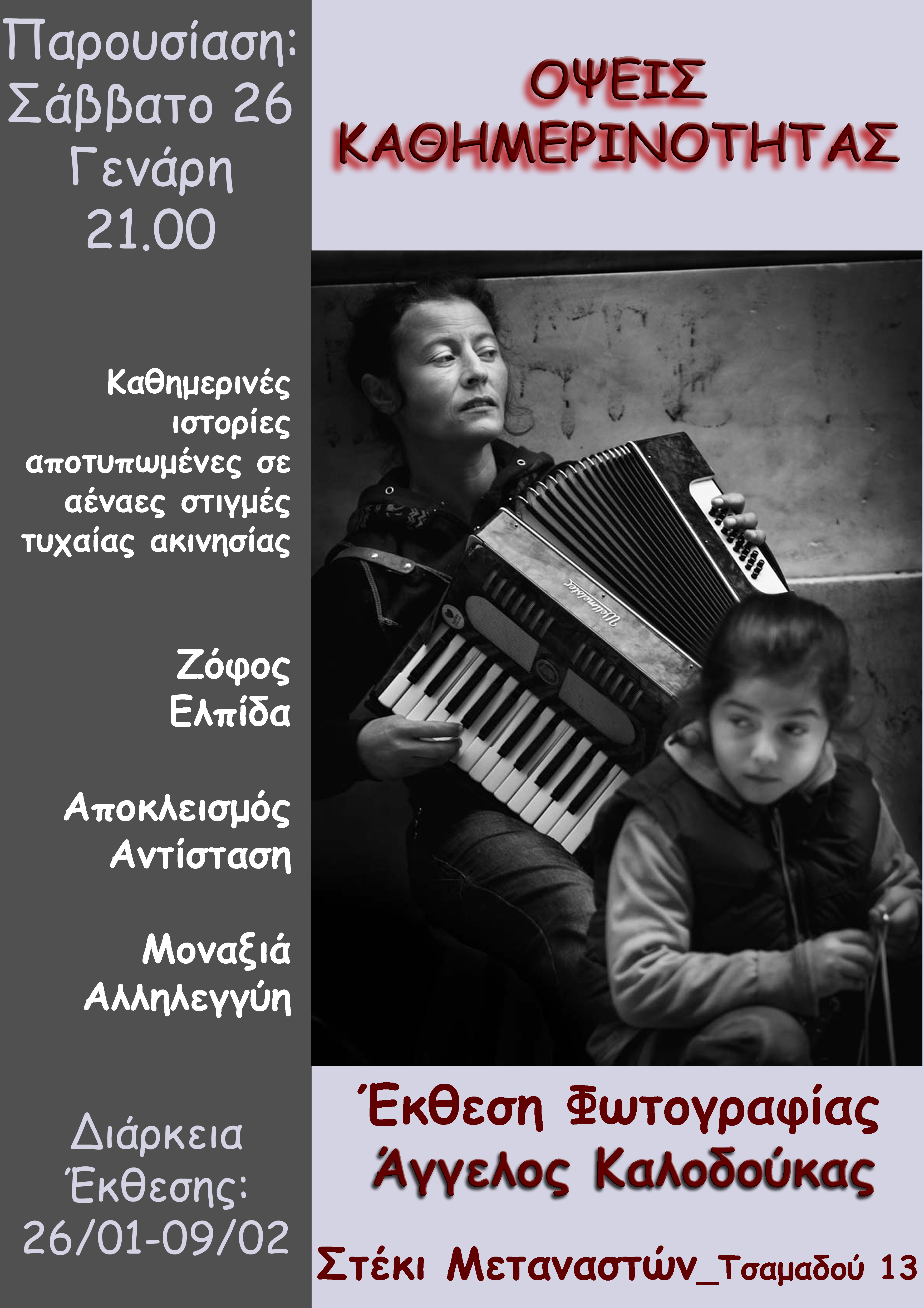 Όψεις Καθημερινότητας, με φυσική σκηνικότητα, αποτύπωση της στιγμής και του συναισθήματος στον χώρο και στον χρόνο. Καθημερινές ιστορίες που συμβαίνουν δίπλα μας, με έντονα κριτική διάθεση στην ωμότητα απέναντι στους σύγχρονους αθλίους των Αθηνών. Τα ζητήματα επιβίωσης και έντονης συναισθηματικής φόρτισης, που θέτει ο Άγγελος Καλοδούκας, δεν μπορεί παρά να αποτελέσουν μια γροθιά στο στομάχι. Απλοί καθημερινοί άνθρωποι παρουσιάζονται σε αέναες στιγμές τυχαίας ακινησίας, με τα συναισθήματα να εναλλάσσονται από εκείνα της απόγνωσης και του φόβου, σε συνθήματα ελπίδας. Οι απόκληροι μιας “σύγχρονης” κοινωνίας, ο ηθικός ξεπεσμός, αλλά και η αξιοπρέπεια του “επιούσιου άρτου”, είναι το κοινωνικό στίγμα που θέλει να θίξει ο φωτογράφος, ο οποίος έντονα νοσταλγικά αναστοχάζεται παλιές χαμένες αξίες μέσα στον χρόνο. Η αποτύπωση των αγγελικών ψυχών μέσα στον δημόσιο χώρο μπαίνει ως τελεσίδικη, φανερώνοντας την τελική πράξη: Η οικειοποίηση του χώρου θα γίνει είτε μαζικά και δυναμικά, είτε ατομικά και ηττημένα. Σε κάθε περίπτωση η ελπίδα που αποπνέει δεν μπορεί παρά να υπενθυμίζει πως “είμαστε ακόμα ζωντανοί”…