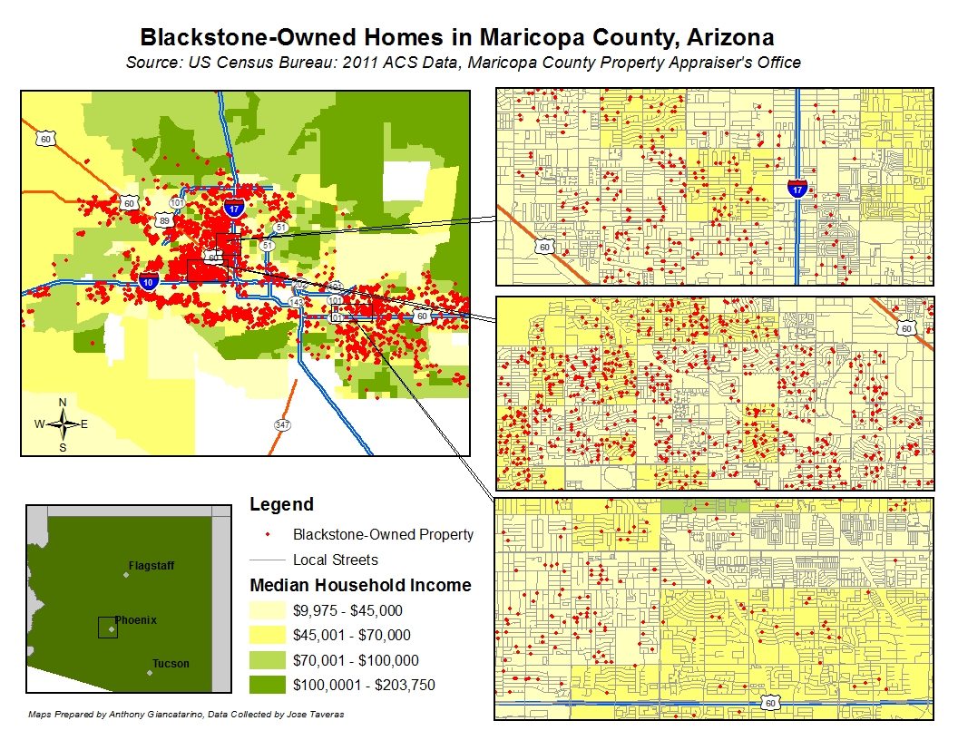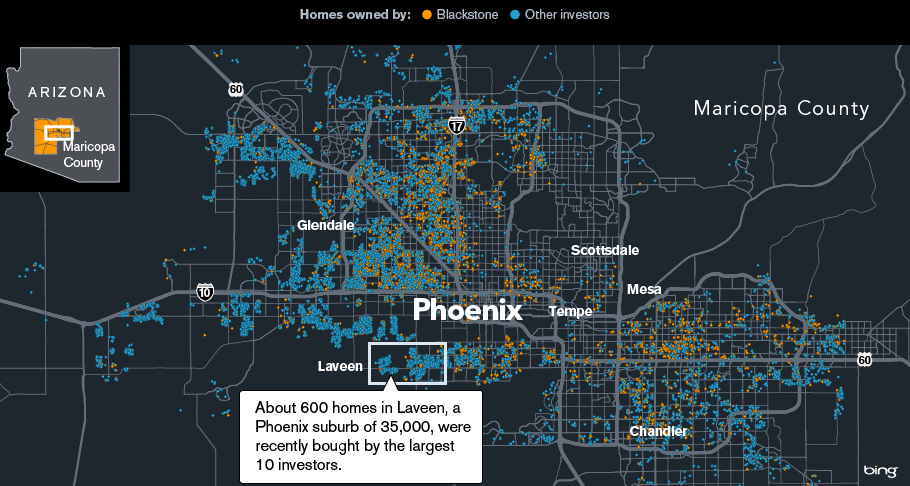 Η μεγαλύτερη και σημαντικότερη από αυτές είναι η Blackstone, η οποία μέσω της θυγατρικής της Invitation Homes αποτελεί σήμερα τον μεγαλύτερο σπιτονοικοκύρη στις ΗΠΑ, καθώς έχει στην ιδιοκτησία της 41.000 ακίνητα (κυρίως μονοκατοικίες), χάρη στις πιστώσεις δισεκατομμυρίων δολαρίων που εξασφαλίζει από την Deutsche Bank (Gopal, 2014). H Blackstone αγοράζει ακίνητα από πλειστηριασμούς, από τοπικούς μεσίτες ή απευθείας από τράπεζες, ενώ μέσω εταιρειών που ελέγχει έχει επεκταθεί και στα κόκκινα δάνεια. Πρόκειται για γιγαντιαία εταιρεία με ενεργητικό μεγαλύτερο των 210 δις δολαρίων. Είναι εισηγμένη στο χρηματιστήριο και το 61% των μετοχών της ανήκει σε θεσμικούς επενδυτές, μεταξύ των οποίων βρίσκονται τα μεγαλύτερα αμερικάνικα τραπεζικά ιδρύματα και εταιρείες χρηματοοικονομικών υπηρεσιών όπως η Morgan Stanley, η Citygroup, η Bank of America αλλά και η γερμανική Deutsche Bank κ.ά. (Gottesdiener, 2013).