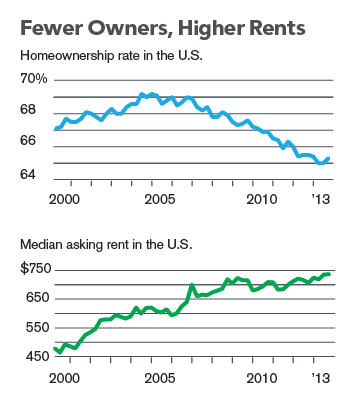 Τελικά το σκηνικό που διαμορφώνεται αποτελεί μία αλλαγή ιστορικών διαστάσεων• η μεγάλη συγκέντρωση κεφαλαίου στον κλάδο των μισθώσεων έχει σαν αποτέλεσμα, όπως χαρακτηριστικά λέγεται, να μετατρέπεται η ενοικίαση κατοικίας από «μικρή επιχειρηματική ενασχόληση της μαμάς και του μπαμπά», σε μια μεγάλη και σύγχρονη επιχειρηματική δραστηριότητα. Η δραστηριότητα αυτή είναι επεκτεινόμενη και αναμένεται να επεκταθεί ακόμα περισσότερο τα επόμενα χρόνια. Η τρέχουσα κρίση μεταξύ άλλων συνεπάγεται αφενός διαρκή λιτότητα και εργασιακή επισφάλεια και αφετέρου αυστηρούς περιορισμούς οι οποίοι τίθενται και θα τίθενται για πολύ καιρό ακόμη στον ενυπόθηκο δανεισμό. Τα παραπάνω οδηγούν, όπως φαίνεται και στην εικόνα 1, σε αύξηση της ζήτησης για ενοικίαση κατοικίας, πτώση του ποσοστού ιδιοκατοίκησης και αύξηση του μέσου ενοικίου. Σε αυτή την αναδυόμενη αγορά ενοικιαζόμενης κατοικίας στις ΗΠΑ, επικρατούν λίγες πολύ μεγάλες εταιρείες όπως η Blackstone, η Colony Capital και η American Homes 4 Rent (Gopal, 2014).