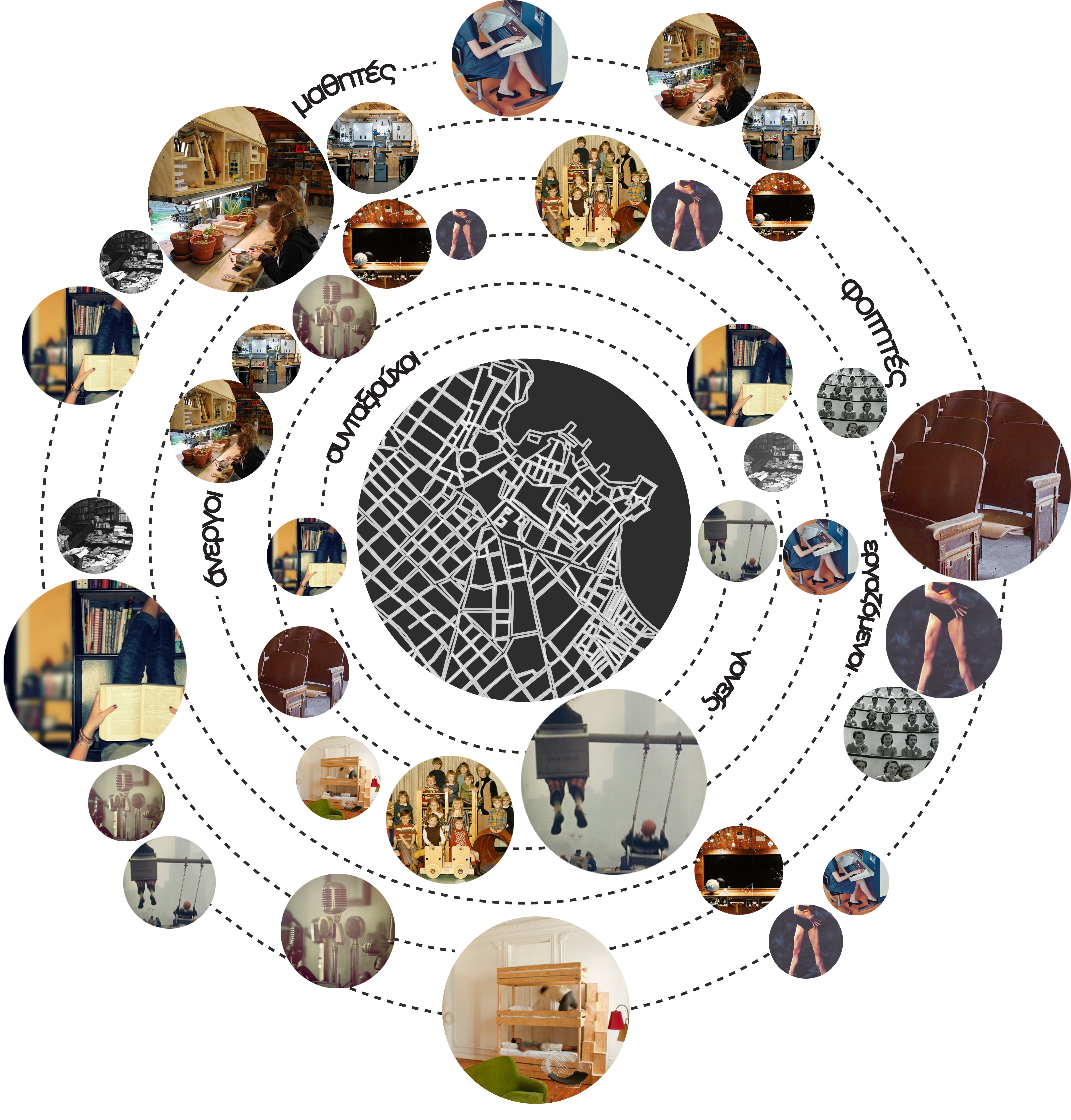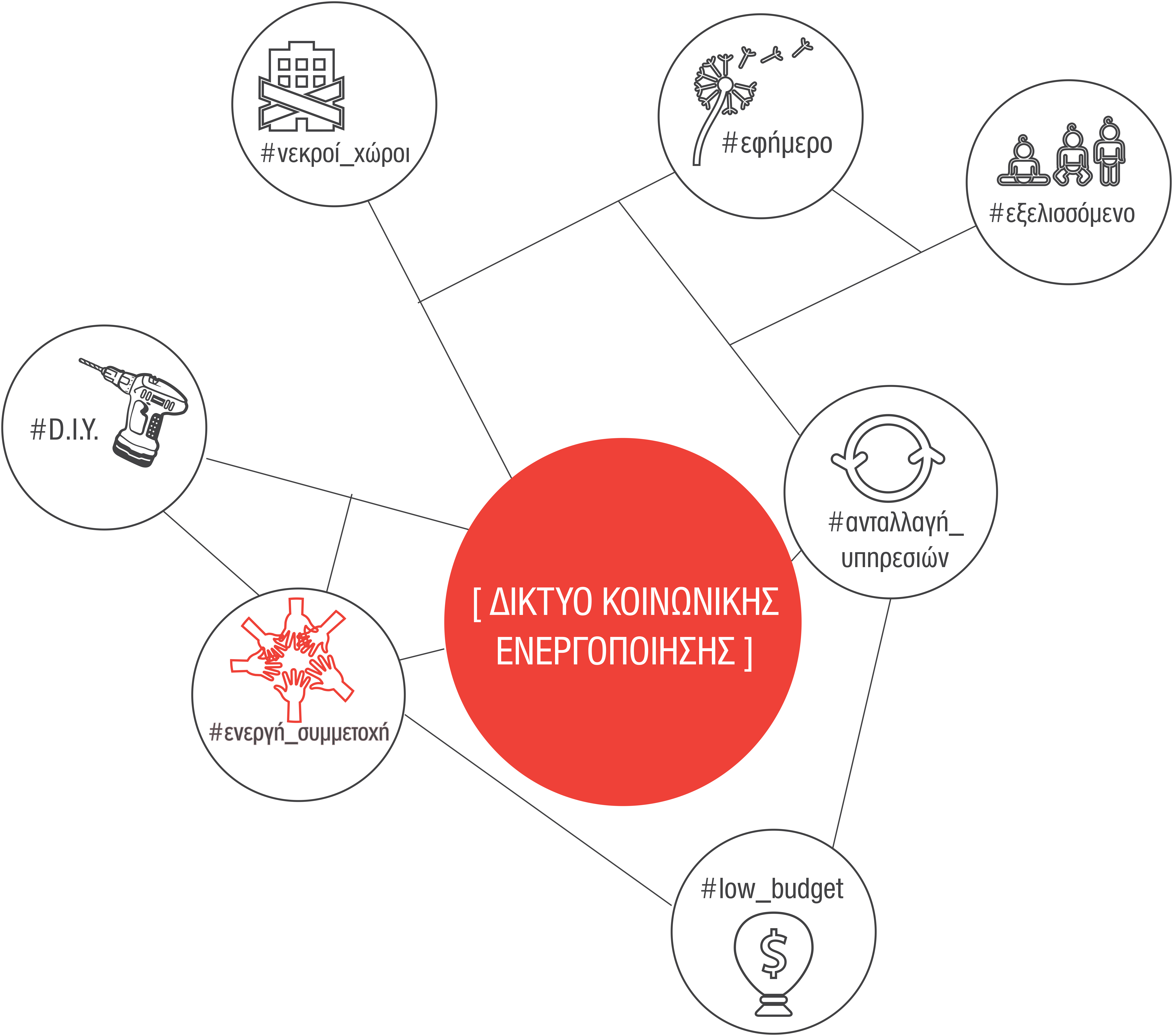 Η διπλωματική εργασία που παρουσιάζεται εδώ περιλαμβάνει τη σχεδίαση με φτηνά και εφήμερα υλικά του εσωτερικού χώρου πέντε εγκαταλελειμένων κτιρίων και γενικότερα ανενεργών χώρων με πρόθεση τη διαμόρφωση ενός δικτύου κοινωνικής ενεργοποίησής τους, στο πλαίσιο της αντιμετώπισης των προβλημάτων και των αναγκών των κατοίκων και ειδικά των νέων της πόλης των Χανίων. Το δίκτυο αυτό συγκροτείται στην κατεύθυνση της αντιμετώπισης των συνεπειών της τρέχουσας κρίσης μέσω της μη-εμπορευματικής ανταλλαγής προϊόντων και υπηρεσιών στο πλαίσιο της κοινωνικής αλληλεγγύης. Για την καλύτερη προσέγγιση αυτών των αναγκών προηγήθηκε ένα στάδιο έρευνας ανάμεσα στους κατοίκους με τη χρήση ερωτηματολογίων και την πραγματοποίηση συνεντεύξεων.