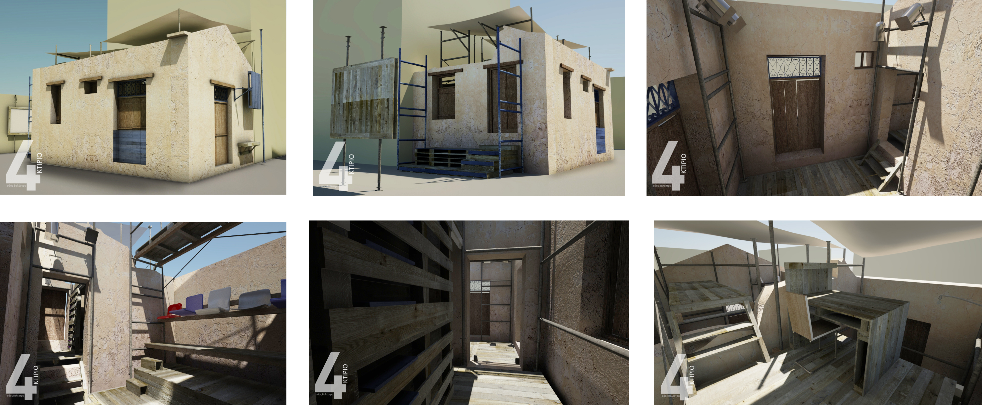 Ο σχεδιασμός αυτών των χώρων περιλαμβάνει κατασκευές, οι οποίες είναι εφήμερες, χαμηλού κόστους, από επαναχρησιμοποιημένα υλικά, όπως σκαλωσιές και παλέτες, τα οποία ανασυντίθενται με τέτοιο τρόπο, ώστε να παράγουν πρωτότυπες μορφές και αισθητική. Δεν παρεμβαίνουν στο υφιστάμενο κέλυφος, συνθέτουν τα όρια και τους εσωτερικούς χώρους, δημιουργώντας ταυτόχρονα διακριτικές παρεμβάσεις στις όψεις. Οι παρεμβάσεις αυτές, εμφανίζουν μια τυπολογία, μια επαναλαμβανόμενη αντιμετώπιση σχεδίασης και λογικής, έτσι ώστε να γίνονται διακριτές, με σκοπό να διαμορφώσουν έναν κώδικα στον αστικό ιστό. Με αυτόν τον τρόπο, αναδεικνύουμε το εκάστοτε κτίριο ως πυρήνα κοινωνικής δραστηριότητας, και κατ’ επέκταση ως κύτταρο ενός αναδυόμενου κοινωνικού δικτύου.