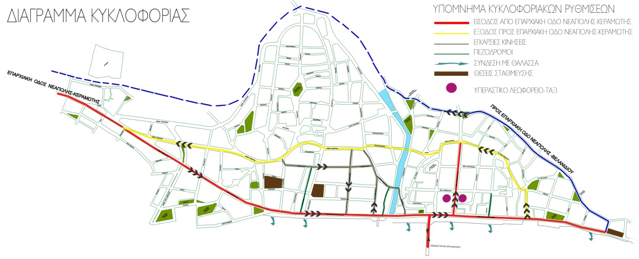 Θεωρούμε ότι η μονοδρόμηση της παραλιακής οδού, με παράλληλη απαγόρευση της στάθμευσης σε όλο το μήκος της και η εκτροπή της κυκλοφορίας των οχημάτων που φτάνουν ακτοπλοϊκά από την περιφερειακή οδό ή της Λεωφόρο Δημοκρατίας, μπορεί να λύσει σε μεγάλο βαθμό το πρόβλημα. Βέλτιστη λύση θα ήταν η αποπεράτωση της περιφερειακής οδού, που θα επέτρεπε να διοχετευτούν κατευθείαν εκτός της πόλης τα οχήματα που έχουν άλλους προορισμούς. Ωστόσο, μέχρι να υλοποιηθεί το συγκεκριμένο έργο προτείνουμε την αναμόρφωση του κυκλοφοριακού δικτύου με ένα συνδυασμό μονόδρομων και οδών διπλής κατεύθυνσης, που φαίνεται στο Διάγραμμα 1.