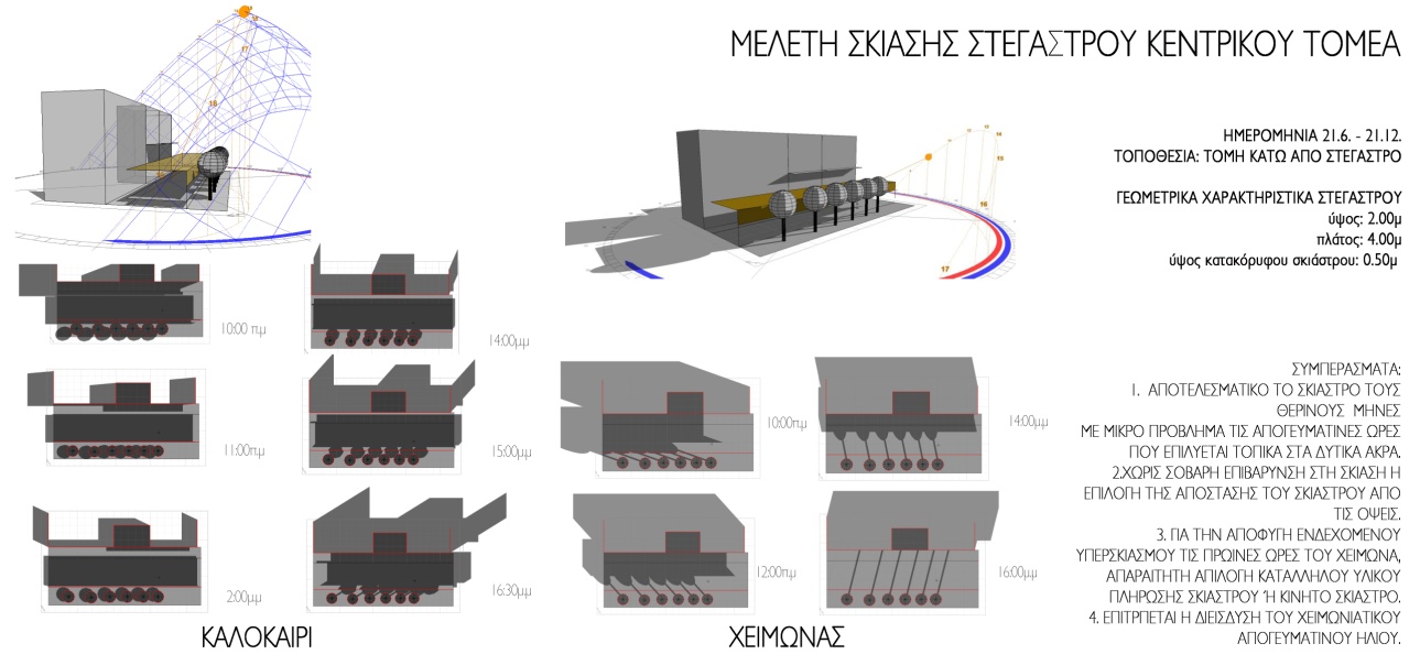 Παράλληλα με το σκελετό αυτό, σχεδιάσαμε μια ζώνη που φιλοξενεί τις ανάγκες σε θέσεις στάθμευσης για τον ανεφοδιασμό των καταστημάτων και για προσωρινή στάθμευση. Η ζώνη αυτή δέχεται επιπλέον και όλο τον απαιτούμενο αστικό εξοπλισμό (φώτα, κάλαθοι αχρήστων, καρτοτηλέφωνα κλπ) και έχει και φυτεμένες περιοχές που ενισχύουν το σκιασμό στις υποκείμενες του στεγάστρου περιοχές. Όπως φαίνεται στο Διάγραμμα 4, το μεταλλικό στέγαστρο και η φύτευση σκιάζουν πλήρως στο μεγαλύτερο μέρος της μέρας τις περιοχές των τραπεζοκαθισμάτων, αλλά και τις κινήσεις των πεζών μπροστά από τα καταστήματα.