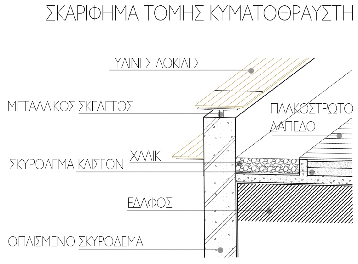 Ο κυματοθραύστης, που στο υπόλοιπο μέρος του διατηρείται όπως υπάρχει σήμερα, γίνεται βασικό στοιχείο της λύσης, καθώς τοποθετείται μια ξύλινη επιφάνεια πάνω του και μια δεύτερη στην εξωτερική πλευρά του για να χρησιμοποιηθεί ως πάτημα. Δίνεται έτσι η δυνατότητα σε όλο το μήκος της διαδρομής, να μπορεί κανείς να σταματήσει και να ξεκουραστεί κοιτώντας τη θάλασσα. Επίσης, πιστεύουμε ότι θα αποτελέσει χαρακτηριστικό τοπόσημο που θα διευκολύνει τη δημόσια συνάθροιση, κυρίως των νεαρότερων ηλικιών.