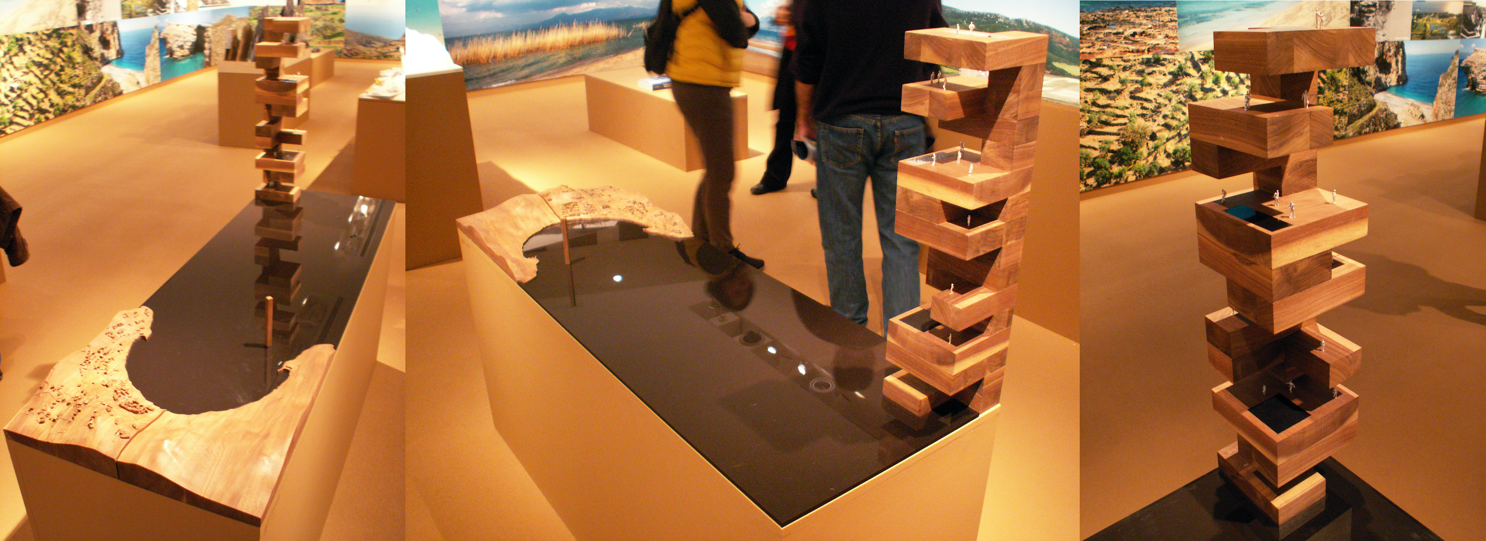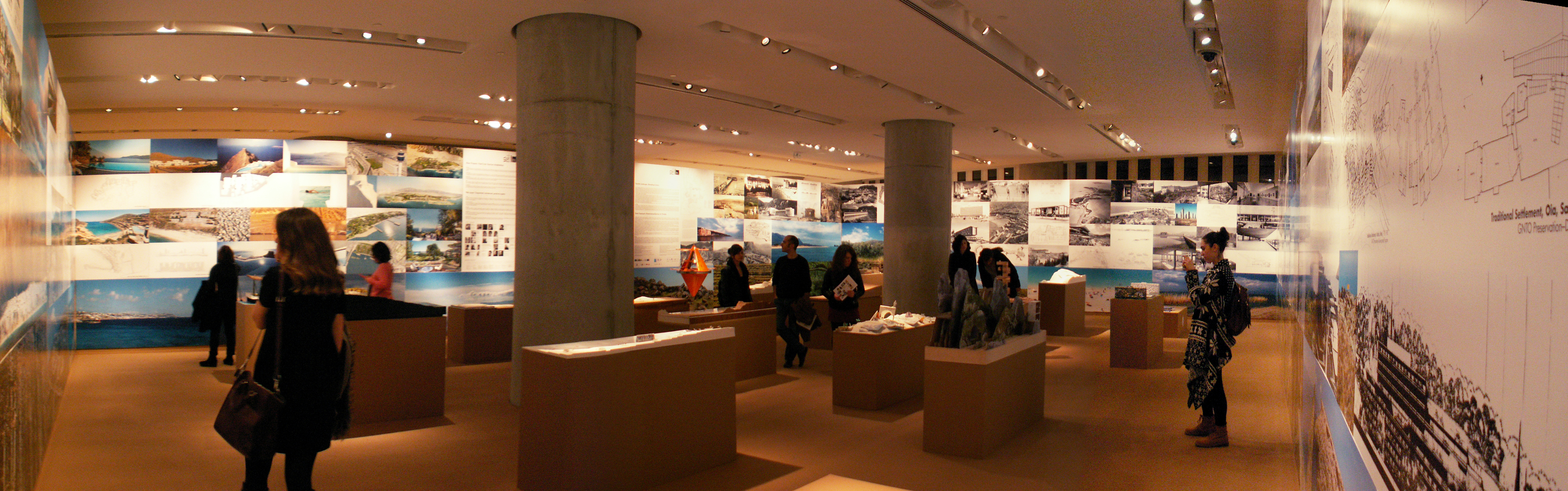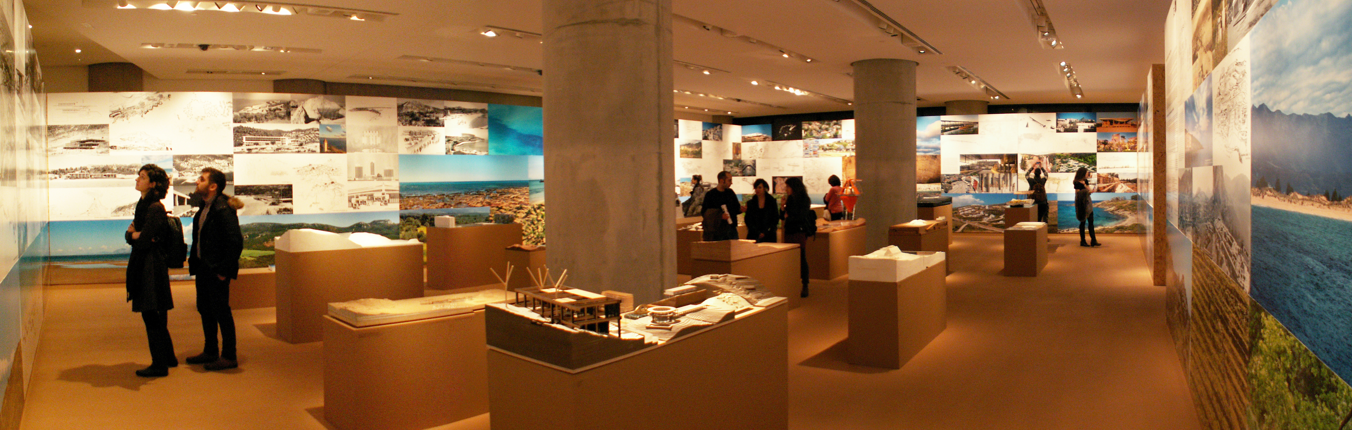Τη δεύτερη ενότητα της έκθεσης αποτελούν οι τοίχοι του χώρου. Οι τελευταίοι λειτουργούν ως background φέροντας εικόνες του ελληνικού τοπίου και μια ανθολογία έργων και μελετών, παρουσιάζοντας έτσι την εξέλιξη της κυρίαρχης “τουριστικής” αρχιτεκτονικής τα τελευταία 100 χρόνια. Σε αυτή εντάσσονται δημόσιοι χώροι όπως ο πεζόδρομος της Ακρόπολης του Δημήτρη Πικιώνη, η πλατεία του Μοναστηρακίου, η νέα παραλία της Θεσσαλονίκης και τα σχέδια για το φαληρικό όρμο και την περιοχή του Ελληνικού. Υπάρχουν επίσης χώροι πολιτισμού όπως το νέο Μουσείο της Ακρόπολης, αλλά και η ίδια η Ακρόπολη. Κυριαρχούν μεγα-projects όπως μεγάλες ξενοδοχειακές μονάδες της δεκαετίας του ’60 και ’70 αλλά και πιο σύγχρονες. Όμως, όλα αυτά αποτυπώνονται με πολύ συμβατικό τρόπο, σε μια εικονογραφική εξιδανίκευση. Τα έργα εμφανίζονται σαν καινούργια χωρίς να επιχειρείται μια αναφορά στην εξέλιξη της χρήση τους, στην πορεία τους στο χρόνο και στον κοινωνικό τους αντίκτυπο. Παρουσιάζονται χαρακτηριστικά υπερπροβεβλημένα παραδείγματα στα οποία προστίθενται στιγμές μιας αρχιτεκτονικής της ευρωστίας, διαφήμισης του πλούτου των λίγων που έχουν τη δυνατότητα να τη χρησιμοποιούν. Όλα αυτά παρατίθενται μαζί με ένα πλήθος φωτογραφιών του σημερινού ελληνικού τοπίου σε ακόμα πιο έντονη εξιδανίκευση. Κλισέ ορίζοντες, ακρογιαλιές και ουρανοί εναλλάσσονται με καταπράσινα λιβάδια, λόφους και βουνοπλαγιές σε εικόνες που μοιάζουν να έχουν αντληθεί από προσπέκτους τουριστικού πρακτορείου. Μερικές (μάλλον λίγες για το ρόλο τους) φωτογραφίες -«στοιχεία ταυτότητας» από γνωστούς επαγγελματίες προσπαθούν να υπονοήσουν κάποια πιο κοινά και βιωματικά στοιχεία της ελληνικής τουριστικής εμπειρίας και να δώσουν μια ανθρωπολογική διάσταση. Τέτοια είναι ανθρώπινα σώματα και καταστρώματα πλοίων, η πανταχού παρούσα άμμος, το υπερβολικό και αλόγιστο χτίσιμο του φυσικού τοπίου κ.α.