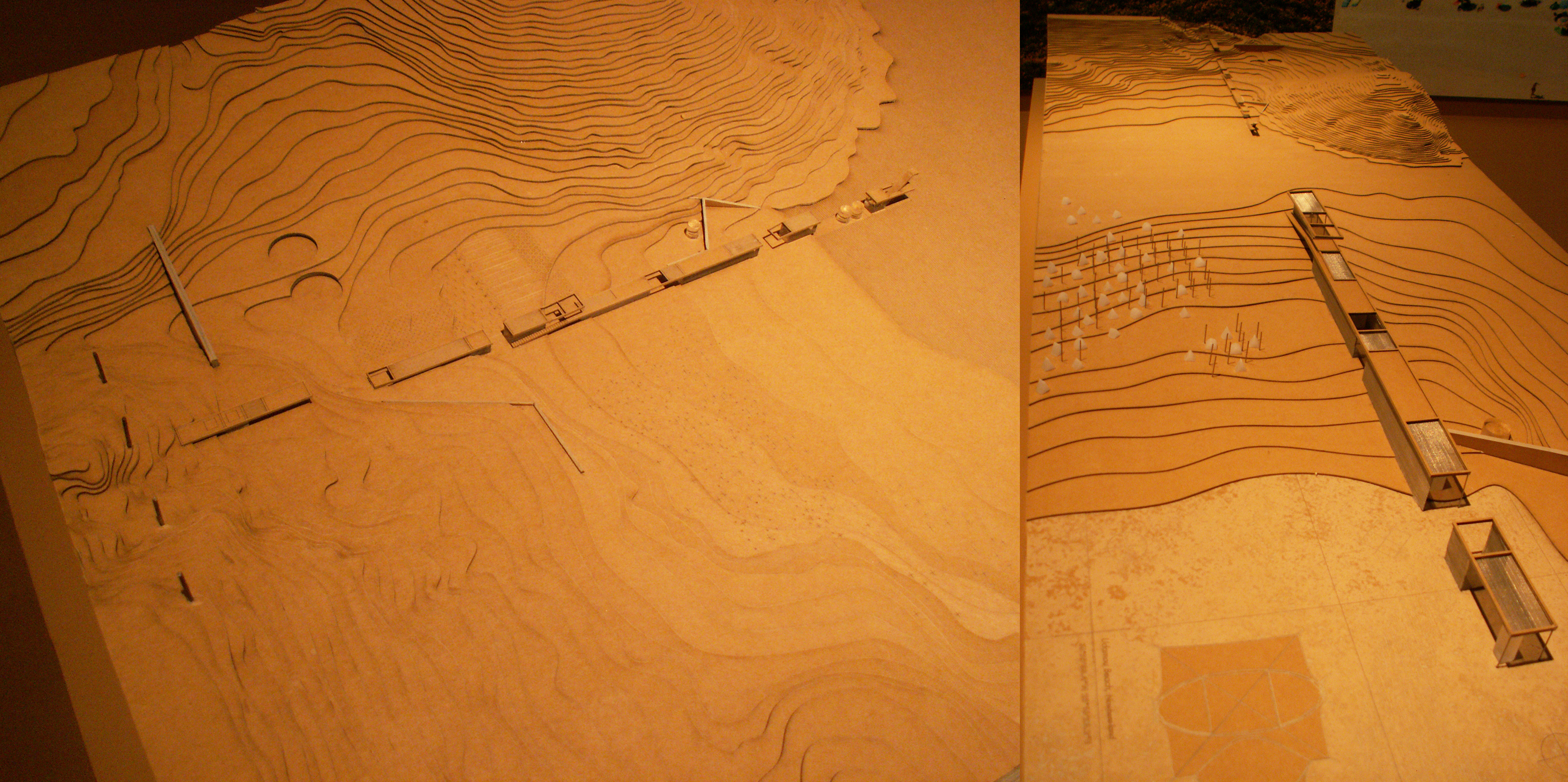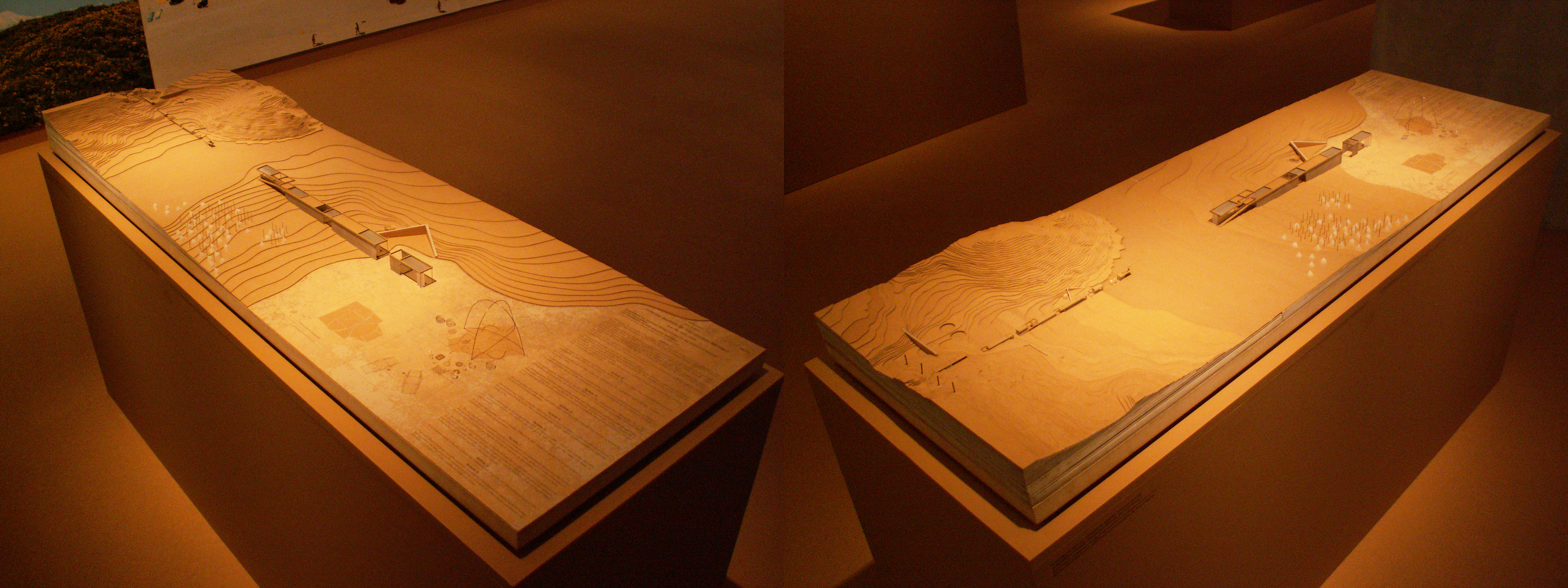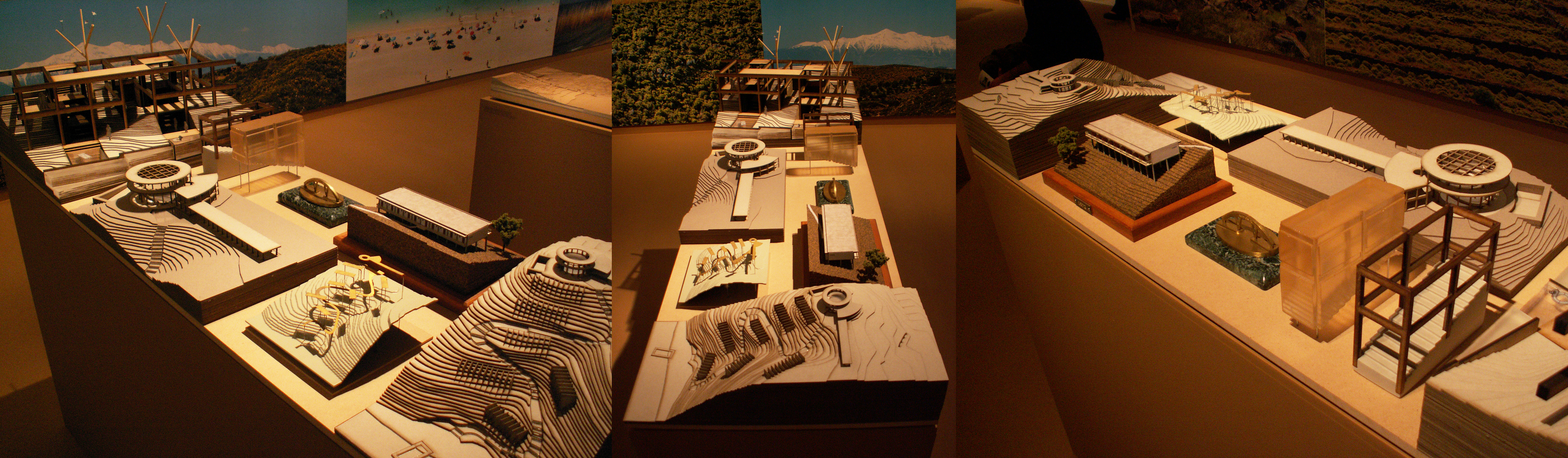 Τη δεύτερη ενότητα της έκθεσης αποτελούν οι τοίχοι του χώρου. Οι τελευταίοι λειτουργούν ως background φέροντας εικόνες του ελληνικού τοπίου και μια ανθολογία έργων και μελετών, παρουσιάζοντας έτσι την εξέλιξη της κυρίαρχης “τουριστικής” αρχιτεκτονικής τα τελευταία 100 χρόνια. Σε αυτή εντάσσονται δημόσιοι χώροι όπως ο πεζόδρομος της Ακρόπολης του Δημήτρη Πικιώνη, η πλατεία του Μοναστηρακίου, η νέα παραλία της Θεσσαλονίκης και τα σχέδια για το φαληρικό όρμο και την περιοχή του Ελληνικού. Υπάρχουν επίσης χώροι πολιτισμού όπως το νέο Μουσείο της Ακρόπολης, αλλά και η ίδια η Ακρόπολη. Κυριαρχούν μεγα-projects όπως μεγάλες ξενοδοχειακές μονάδες της δεκαετίας του ’60 και ’70 αλλά και πιο σύγχρονες. Όμως, όλα αυτά αποτυπώνονται με πολύ συμβατικό τρόπο, σε μια εικονογραφική εξιδανίκευση. Τα έργα εμφανίζονται σαν καινούργια χωρίς να επιχειρείται μια αναφορά στην εξέλιξη της χρήση τους, στην πορεία τους στο χρόνο και στον κοινωνικό τους αντίκτυπο. Παρουσιάζονται χαρακτηριστικά υπερπροβεβλημένα παραδείγματα στα οποία προστίθενται στιγμές μιας αρχιτεκτονικής της ευρωστίας, διαφήμισης του πλούτου των λίγων που έχουν τη δυνατότητα να τη χρησιμοποιούν. Όλα αυτά παρατίθενται μαζί με ένα πλήθος φωτογραφιών του σημερινού ελληνικού τοπίου σε ακόμα πιο έντονη εξιδανίκευση. Κλισέ ορίζοντες, ακρογιαλιές και ουρανοί εναλλάσσονται με καταπράσινα λιβάδια, λόφους και βουνοπλαγιές σε εικόνες που μοιάζουν να έχουν αντληθεί από προσπέκτους τουριστικού πρακτορείου. Μερικές (μάλλον λίγες για το ρόλο τους) φωτογραφίες -«στοιχεία ταυτότητας» από γνωστούς επαγγελματίες προσπαθούν να υπονοήσουν κάποια πιο κοινά και βιωματικά στοιχεία της ελληνικής τουριστικής εμπειρίας και να δώσουν μια ανθρωπολογική διάσταση. Τέτοια είναι ανθρώπινα σώματα και καταστρώματα πλοίων, η πανταχού παρούσα άμμος, το υπερβολικό και αλόγιστο χτίσιμο του φυσικού τοπίου κ.α.