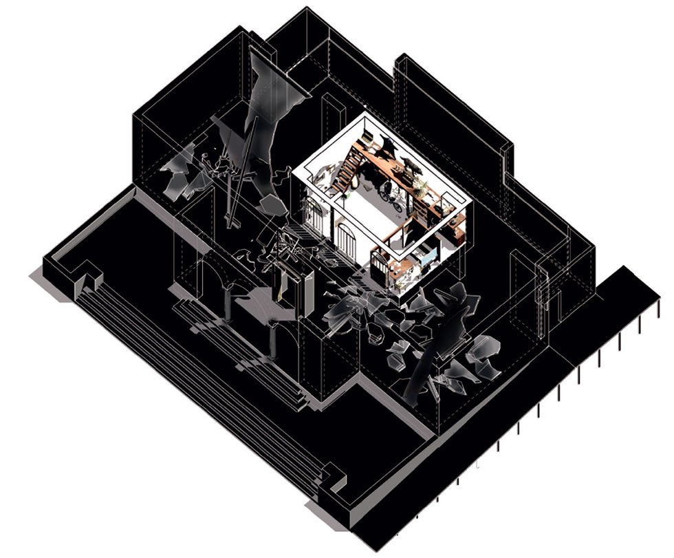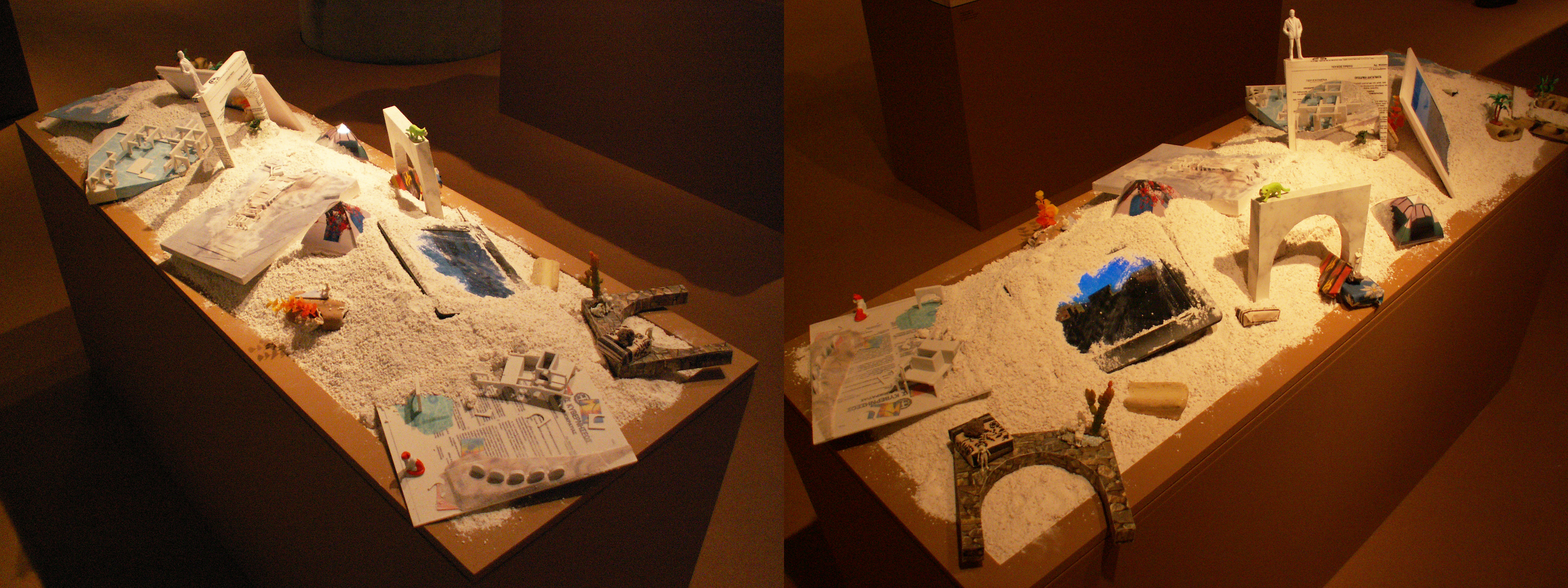 2) Η πρόταση για εναλλακτική τουριστική κατοίκηση ενός ερειπίου από το Studio Angelidakis σε μια προκλητική παρουσίαση που υπενθυμίζει την υλικότητα και αίσθηση του βασικού υποδοχέα της ελληνικής τουριστικής εμπειρίας, της παραθαλάσσιας άμμου.