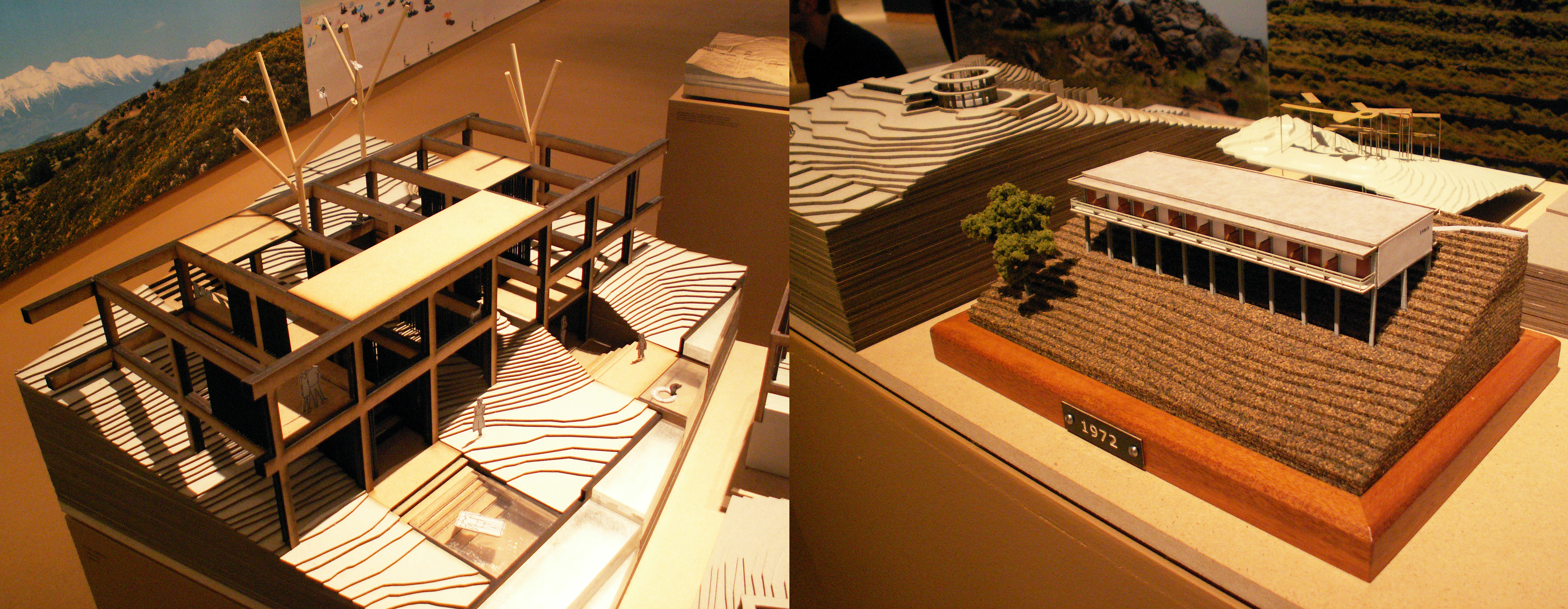 Εξετάζοντας με προσοχή το περιεχόμενο των τοίχων βλέπουμε ότι η διαφοροποίηση του σε σχέση με τα κεντρικά εκθέματα δεν περιγράφεται πλήρως από τη χρονολογική σχέση τους με την κρίση, καθώς κάνουν εκεί την εμφάνισή τους προτάσεις προς μελλοντική υλοποίηση, όπως τα σχέδια για την έκταση του Ελληνικού και τον φαληρικό όρμο. Αντιθέτως το δίπολο μοιάζει πιο πολύπλοκο. Στη μια πλευρά θα μπορούσαμε να τοποθετήσουμε μια αντίληψη-μονοσήμαντο εκφραστή μιας «ανάπτυξης» ταυτόσημης με την οικονομική μεγέθυνση σε συνδυασμό με την εμπορική εκμετάλλευση του τοπίου, μιας αρχιτεκτονικής προς πραγματιστική υλοποίηση στα πλαίσια οικονομικών επιταγών (με σχετική έλλειψη θεωρητικών και σχεδιαστικών αρχιτεκτονικών αναζητήσεων που δεν οδήγησαν σε κτισμένο αποτέλεσμα, ανεξάρτητα με τη σημασία τους και το αντιληπτικό τους αποτύπωμα), που στην κατάληξή της ρέπει προς τη mainstream εικονογράφηση της χλιδής μιας ελίτ. Από την άλλη ίσως υπάρχει μια διάθεση ερευνητικής προσπάθειας για εναλλακτική και καινοτόμα σκέψη με προοδευτικά χαρακτηριστικά και αυξημένες πολιτικές, κοινωνικές και περιβαλλοντικές ευαισθησίες, εκφρασμένη με ελευθερία ουτοπίας. Βεβαίως οι εξαιρέσεις υπάρχουν και από τις δύο πλευρές: ο ιστοριογραφικός χαρακτήρας του περιεχομένου των τοίχων (ο οποίος σε ένα βαθμό αναιρείται από την απουσία λιγότερο επιτυχημένων παραδειγμάτων αντίστοιχης δυναμικής) υπενθυμίζει την καινοτομία, ακόμα και προοδευτικότητα των απεικονιζόμενων κτιρίων για την εποχή τους. Από την άλλη, στις νέες προτάσεις πολλές φορές κυριαρχεί η μεγάλη κλίμακα που, παρά το ενδιαφέρον και την τόλμη που παρουσιάζουν στη σχέση με το τοπίο και τη διαβίωση που προτείνουν, υπονοούν για την υλοποίησή τους πόρους και ενέργεια αναντίστοιχους προς τα πιθανά κοινωνικά και περιβαλλοντικά οφέλη που θα μπορούσαν να προκαλέσουν (πρέπει βεβαίως να θυμόμαστε ότι περισσότερο παίζουν τον ρόλο της θεωρητικής τροφής για σκέψη παρά προτάσεις προς άμεση υλοποίηση). Επίσης τα περισσότερα θα μπορούσαν να λειτουργήσουν άνετα στα πλαίσια του υπάρχοντος οικονομικού συστήματος ως απλές μηχανές παραγωγής κερδοφορίας.