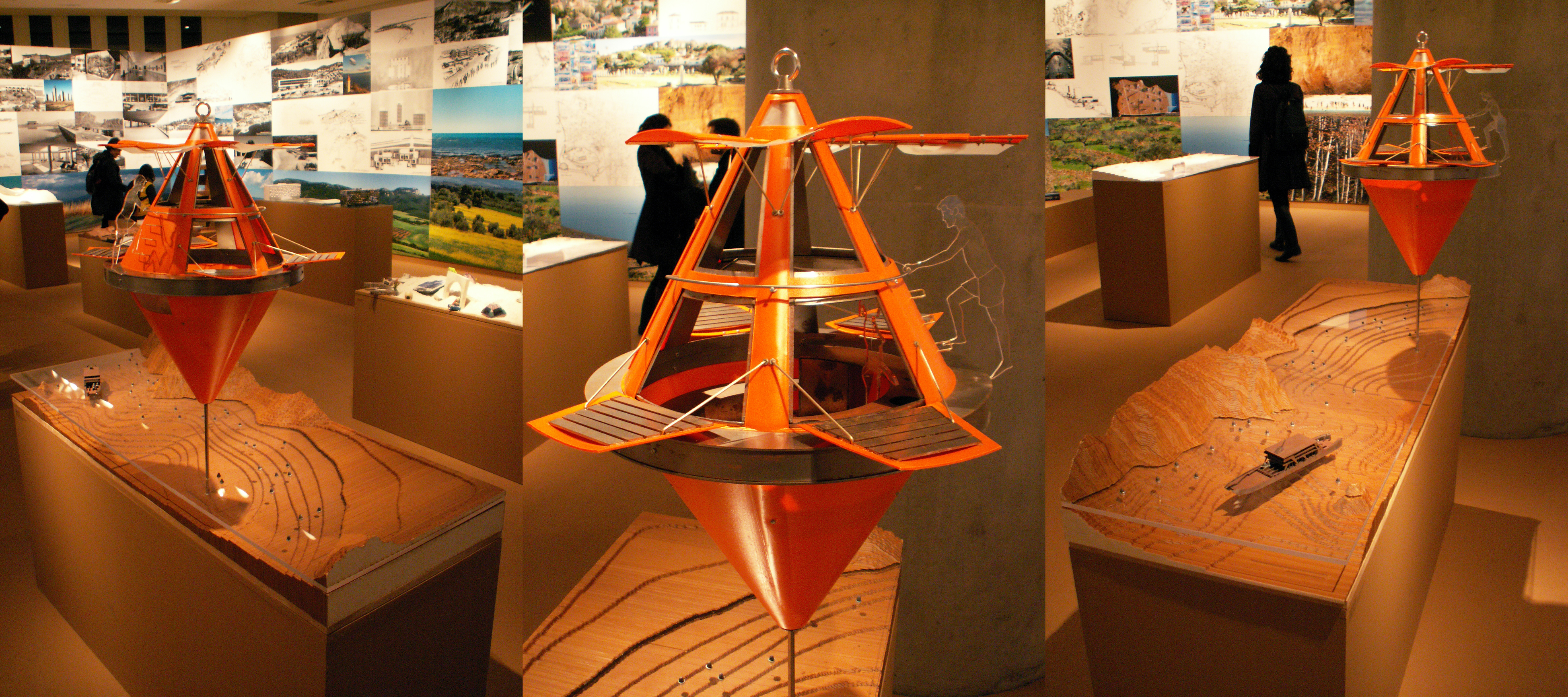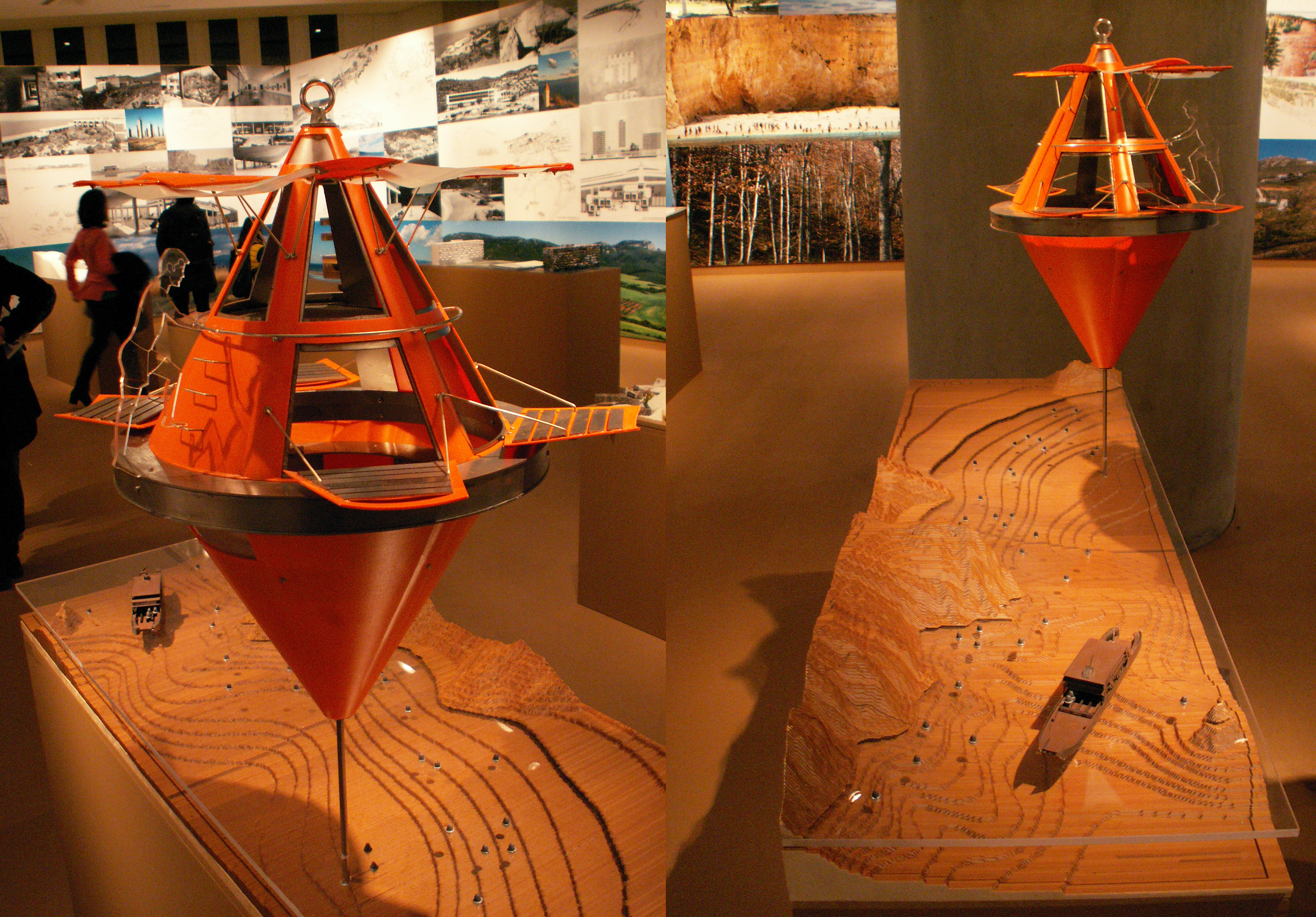 6) Ο Ζήσης Κοτιώνης με έναν ενδιαφέρων σχεδιασμό παιδικής απλότητας, παρουσιάζει ένα σενάριο συλλογικής κατοίκησης χαμηλού περιβαλλοντικού αποτυπώματος, βασισμένο σε μια μονάδα-αμφίβια κάψουλα με τη μορφή μεγεθυμένης σημαδούρας.