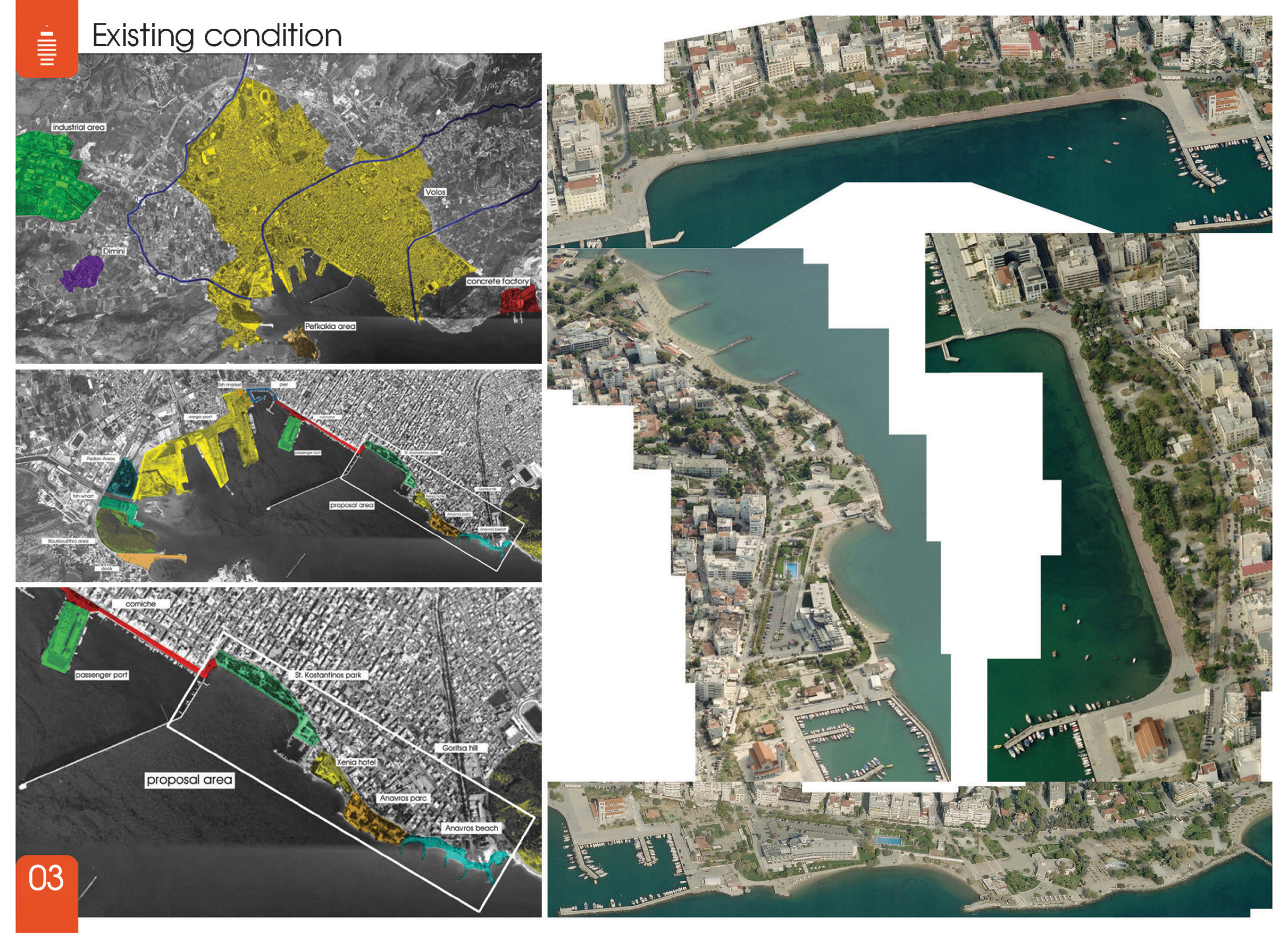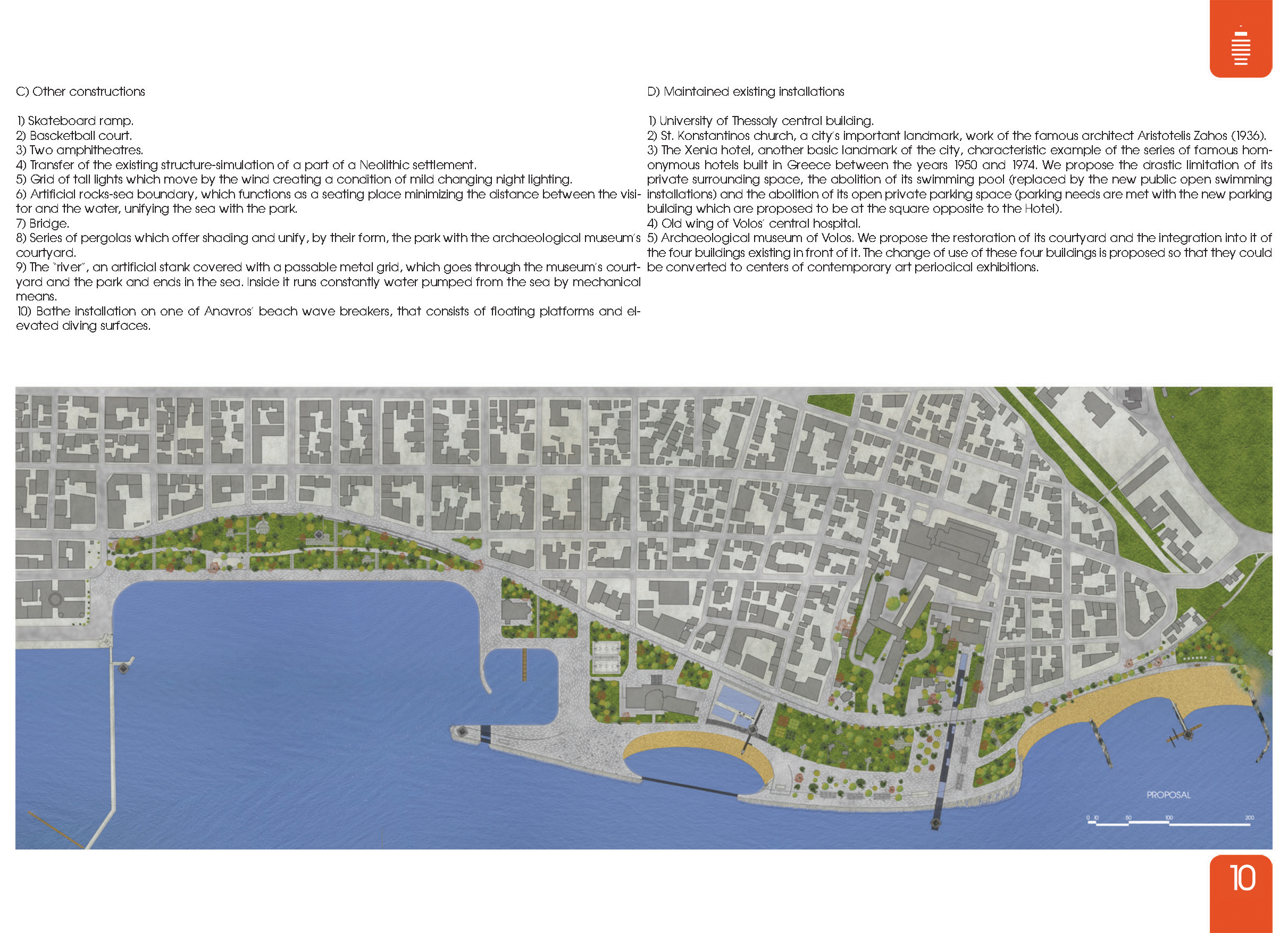 Η πρώτη είναι η επέμβαση στο σχήμα της ακτογραμμής με μεγάλες καθαρές κινήσεις οι οποίες κάνουν την περιοχή ένα ακόμα διακριτό και συνεχές τμήμα του συνόλου του μετώπου του Βόλου.