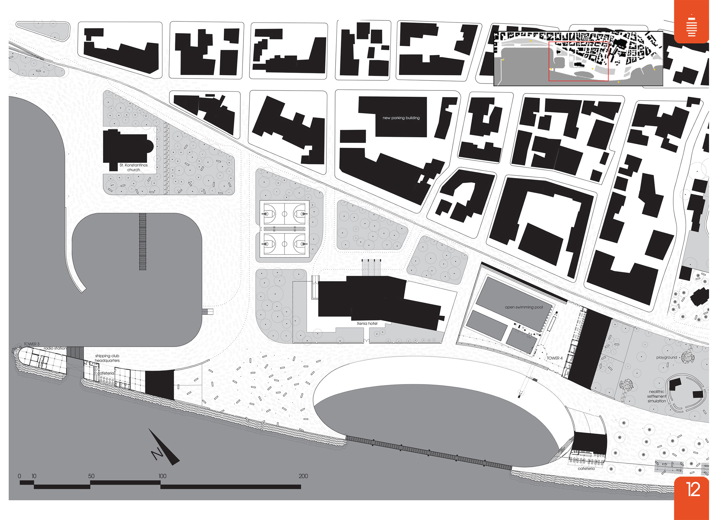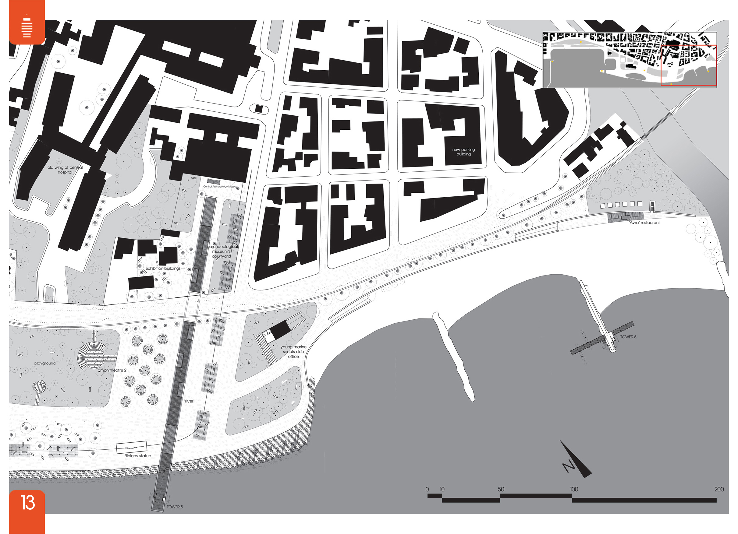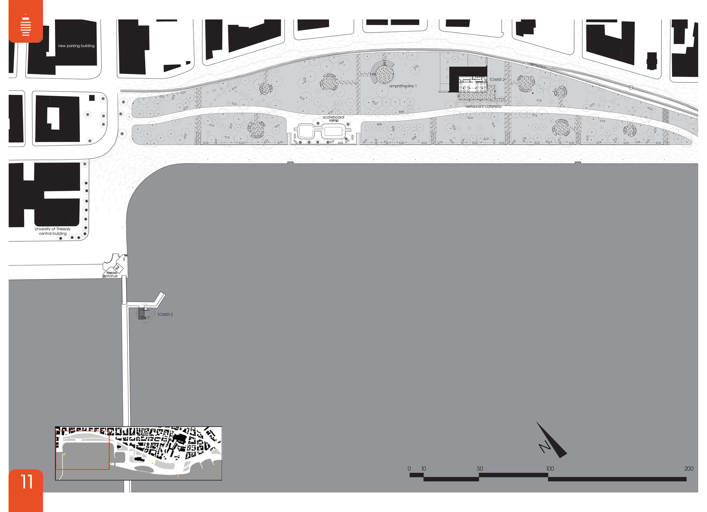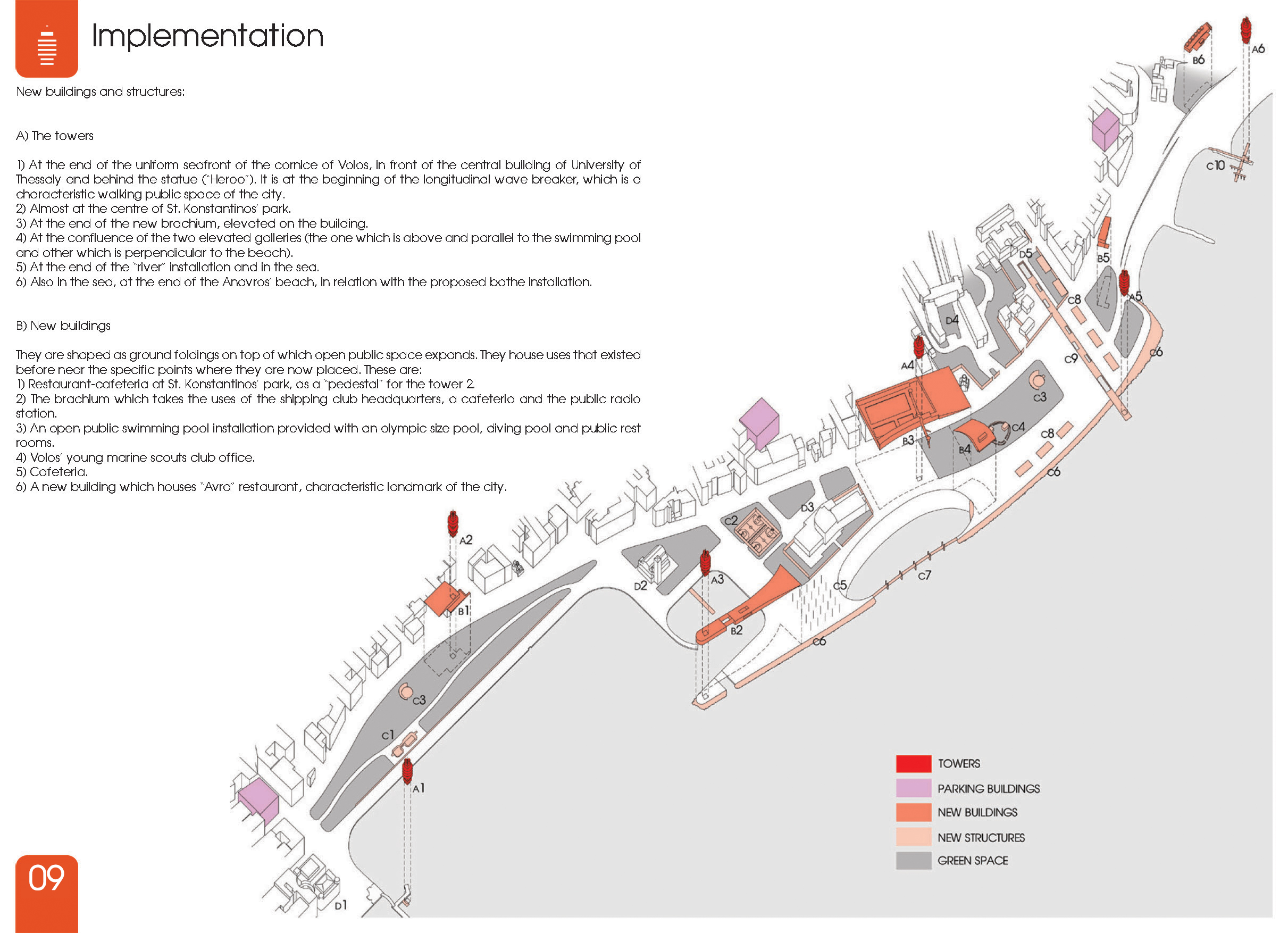 Στη συνέχεια κυρίαρχο ρόλο παίζουν οι έξι πύργοι που προσθέτουμε σε χαρακτηριστικά σημεία, οι οποίοι με την επαναλαμβανόμενη εικόνα τους αλλά και τη χρήση τους (δυνατότητα περισκοπικής και από μεγάλο ύψος θέασης της περιοχής) δίνουν την ευκαιρία σύλληψης του συνόλου το πάρκου ως ένα σύστημα κοινών διακριτών δομών. Με την εξαίρεση του ξενοδοχείου Ξενία και του ναού του Αγίου Κωνσταντίνου αφαιρούνται τα υπάρχοντα κτίσματα και στη θέση τους προσθέτονται νέα τα οποία προξενούν κάποια ένταση χρήσεων και πόλους έλξης. Τα τελευταία δημιουργούνται μέσω εδαφικών πτυχώσεων, μεγιστοποιώντας την έκταση του ανοιχτού δημόσιου χώρου ο οποίος πλέον περιλαμβάνει και τις στέγες τους, ενώ βεβαίως αποκτούν μια ιδιαίτερη και στενή σχέση με το έδαφος αφήνοντας τους πύργους να αποτελούν το κυρίαρχο ψηλό στοιχείο. Το μέτωπο του πάρκου προς την πόλη ομογενοποιείται σε έναν συνεχή δρόμο μικρής κυκλοφορίας και ταχύτητας, ενώ οι απαιτήσεις για χώρους στάθμευσης καλύπτονται από τρία νέα κτίρια parking τα οποία επουλώνουν κενά στον αστικό ιστό και δημιουργούν κατά κάποιο τρόπο τρεις διαφορετικές εισόδους στην περιοχή.