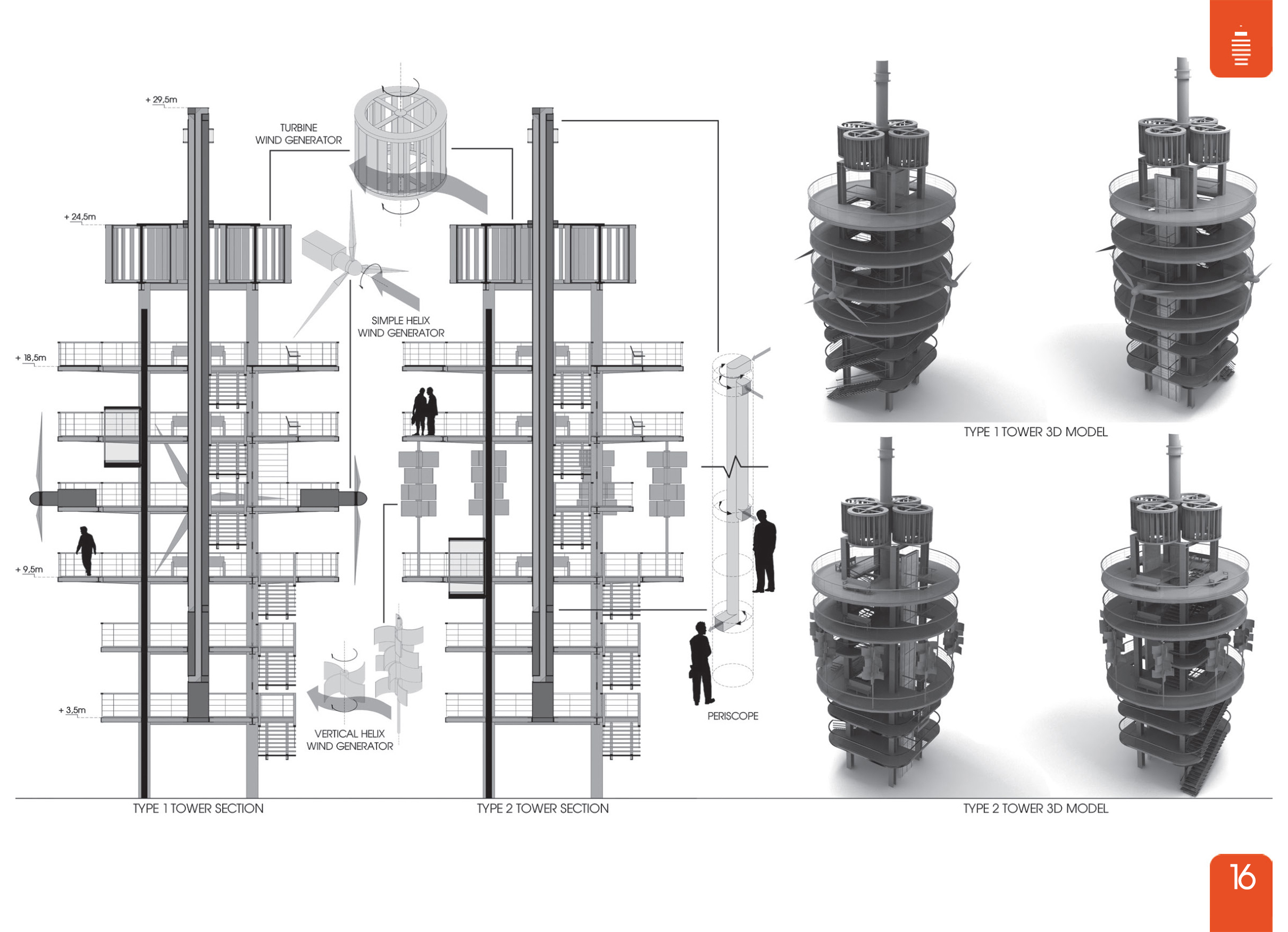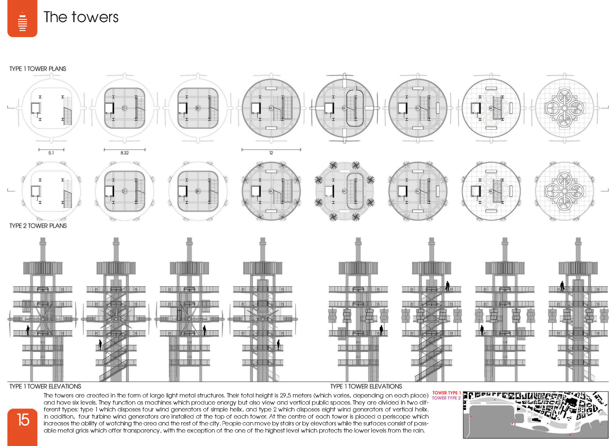Οι πύργοι διαμορφώνονται ως μεγάλες ελαφριές μεταλλικές κατασκευές. Το τελικό τους ύψος είναι 29,5 μέτρα (διαφοροποιείται ανάλογα με την τοποθεσία) και διαθέτουν 6 επίπεδα. Λειτουργούν ως μηχανές παραγωγής ενέργειας αλλά και θέασης και κάθετου δημόσιου χώρου. Χωρίζονται σε δύο διαφορετικούς τύπους: τον τύπο 1 ο οποίος διαθέτει τέσσερις ανεμογεννήτριες απλού έλικα, και τον τύπο 2 που διαθέτει οχτώ ανεμογεννήτριες κάθετου έλικα. Επίσης στην κορυφή κάθε πύργου είναι εγκατεστημένες τέσσερις ανεμογεννήτριες τύπου τουρμπίνας. Στο κέντρο κάθε πύργου έχει τοποθετηθεί ένα περισκόπιο που αυξάνει τις δυνατότητες παρατήρησης της περιοχής και της υπόλοιπης πόλης. Η κίνηση γίνεται μέσω σκάλας ή ανελκυστήρα ενώ οι επιφάνειες αποτελούνται από βατές μεταλλικές σήτες που προσφέρουν διαφάνεια, εκτός της ψηλότερης η οποία διαφυλάσσει τα χαμηλότερα επίπεδα από τη βροχή.