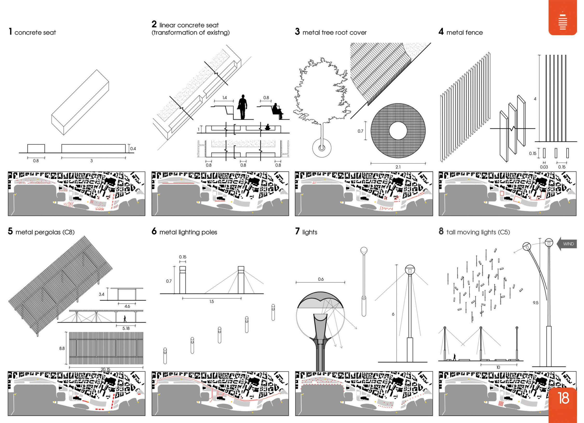 Οι βασικοί στόχοι της εργασίας (υλική, εμπειρική και συνειδησιακή ενοποίηση, σύλληψη, κατανόηση και χρήση της περιοχής) επιχειρείται να ικανοποιηθεί και διαμέσου του σχεδιασμού στην κλίμακα του αστικού εξοπλισμού. Για τον λόγο αυτό επιλέγονται καθαρά στοιχεία που επαναλαμβάνονται σε όλο το μήκος της περιοχής και τα οποία βρίσκονται σε υφολογική συνάφεια μεταξύ τους. Κυρίαρχο στοιχείο αποτελούν οι μπετονένιες κατασκευές (π.χ. καθιστικά, διαμήκη καθιστικά, «φωλιές», «ανεστραμμένες φωλιές», δάπεδα, τεχνητά βράχια) που διαχέονται στο τοπίο καλύπτοντας πολλές ανάγκες εξοπλισμού. Όλες αυτές σχεδιάζονται συνολικά με βάση τις σταθερές διαστάσεις 0,8×0,4x3m.