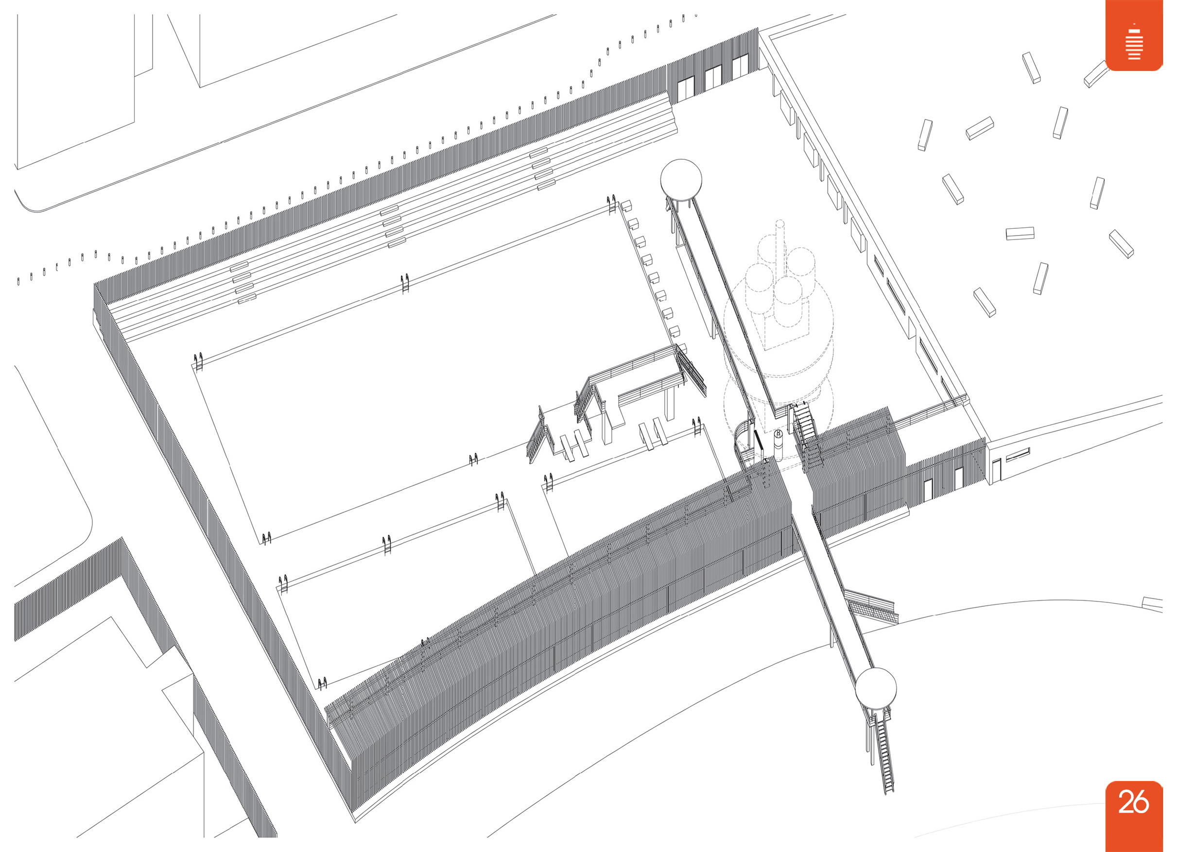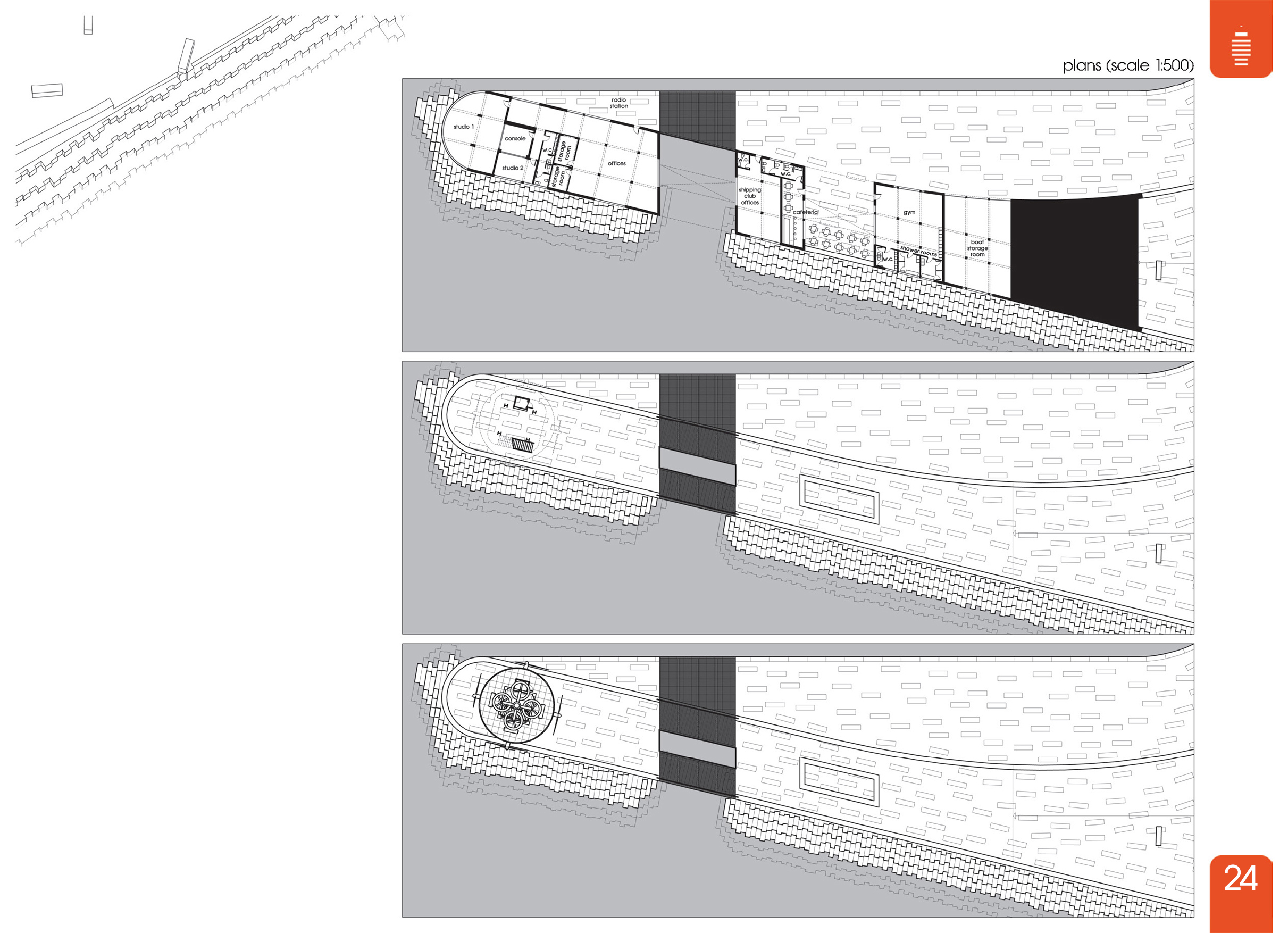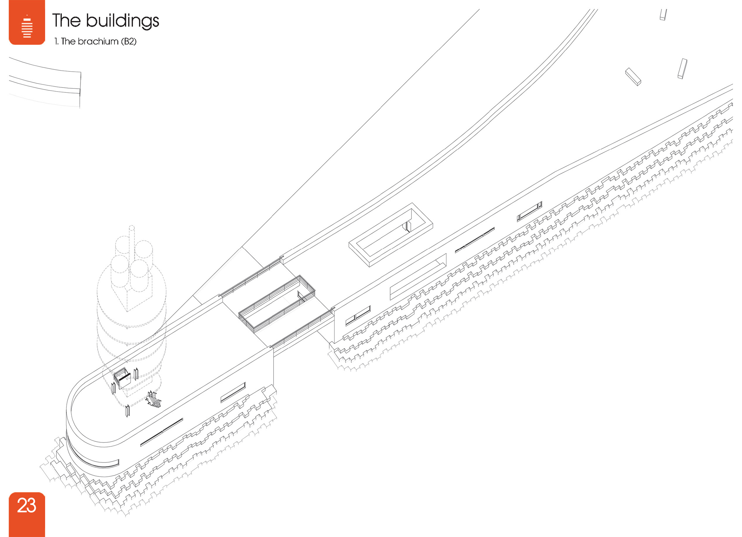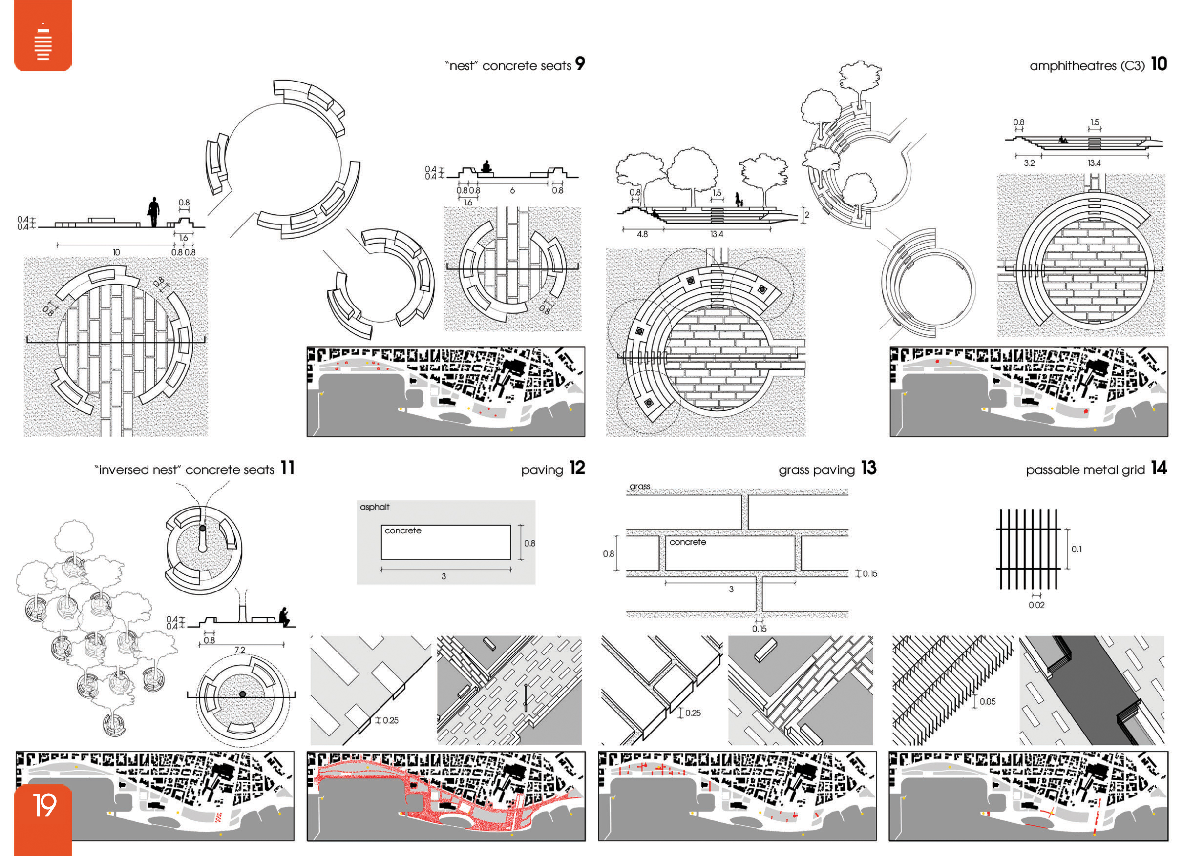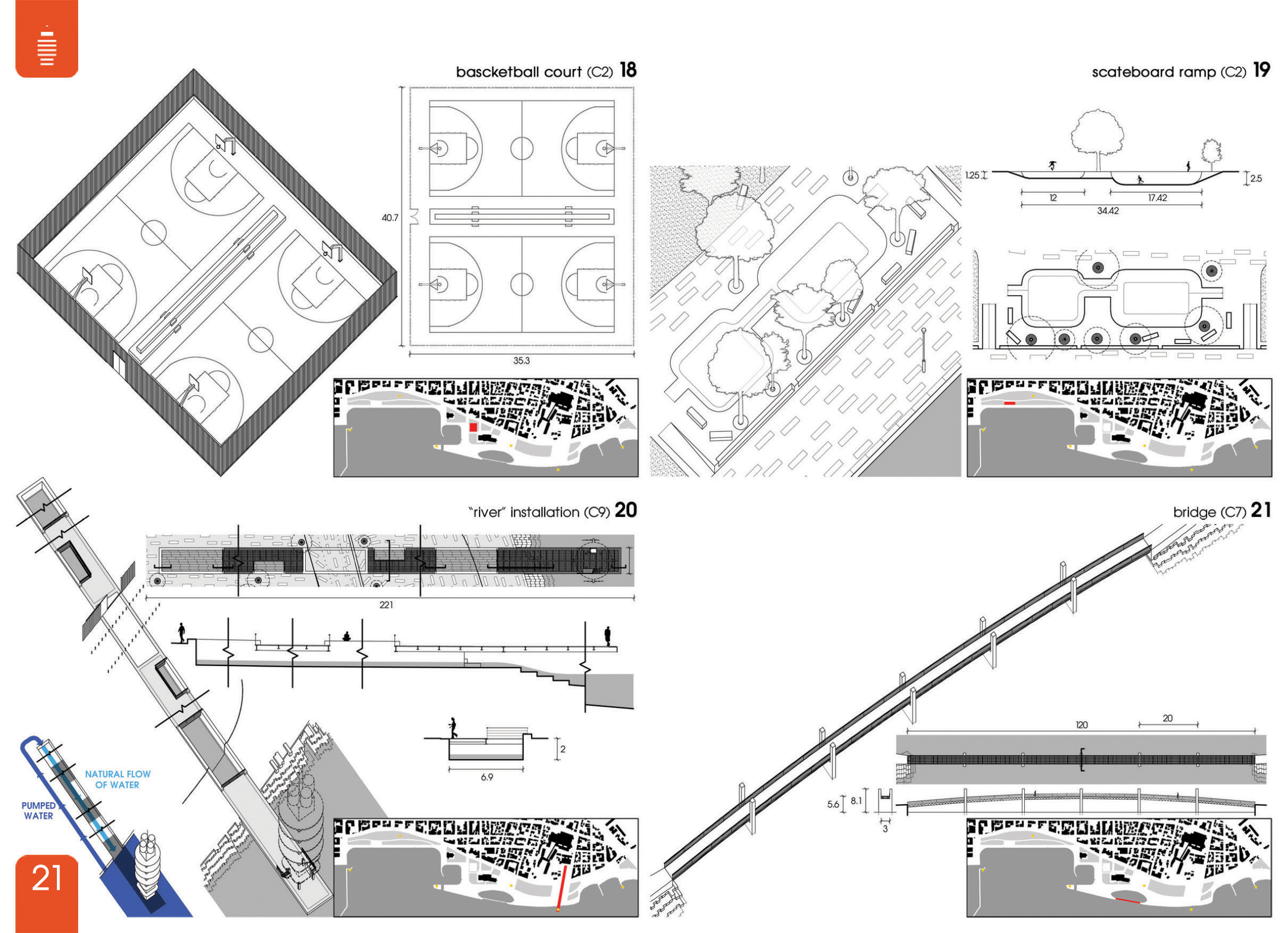 Διαμορφώνονται ως εδαφικές πτυχώσεις πάνω στις οποίες επεκτείνεται ο ανοιχτός δημόσιος χώρος. Στεγάζουν λειτουργίες που προϋπήρχαν κοντά στα συγκεκριμένα σημεία όπου τοποθετούνται. Αυτά είναι: