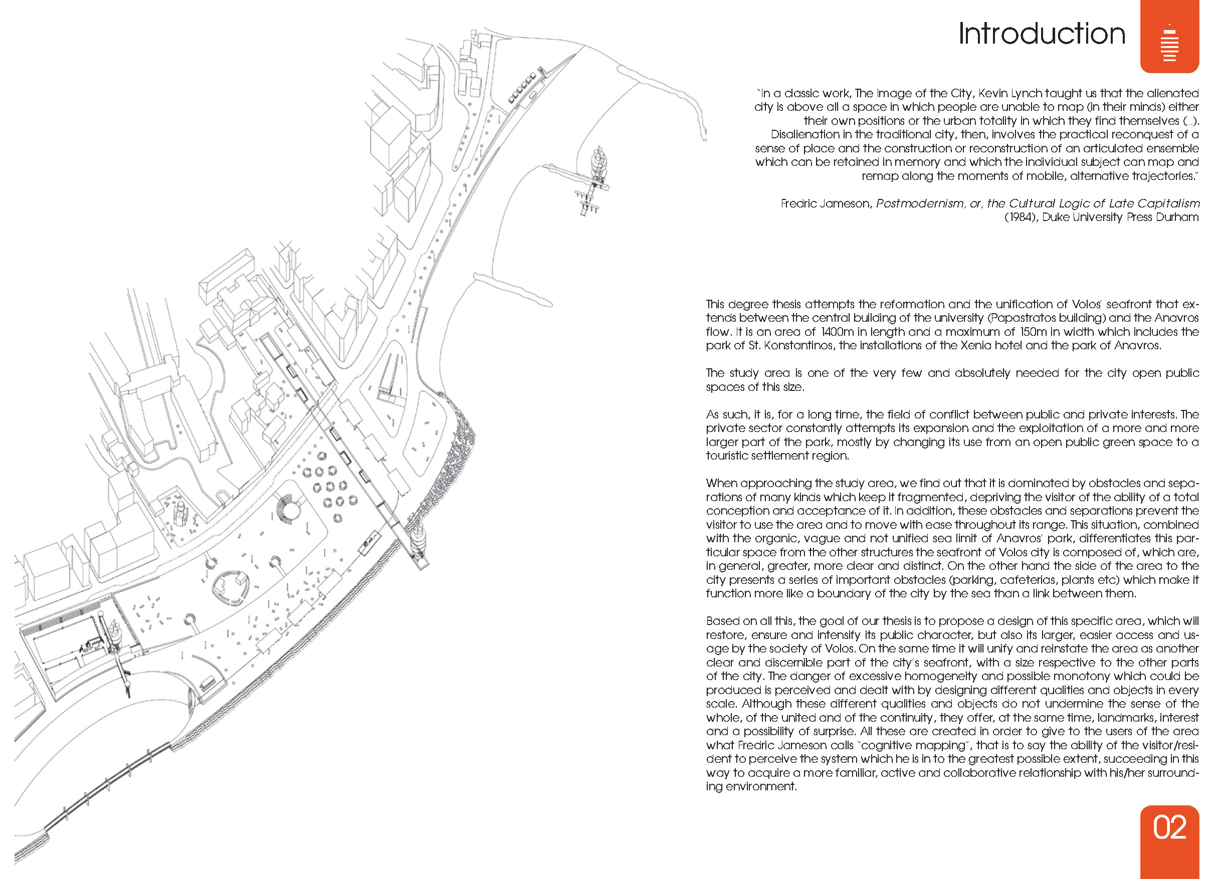 Με βάση όλα αυτά, στόχος της εργασίας είναι να προτείνει έναν σχεδιασμό της συγκεκριμένης περιοχής ο οποίος θα αποκαθιστά, θα διασφαλίζει και θα εντείνει τον δημόσιο χαρακτήρα της, καθώς επίσης και τη μεγαλύτερη, ευκολότερη πρόσβαση και χρήση του από την κοινωνία του Βόλου. Παράλληλα θα την ενοποιεί και θα την αποκαθιστά ως ένα ακόμα καθαρό και διακριτό τμήμα του μετώπου της πόλης, αντίστοιχου μεγέθους με τα υπόλοιπα. Ο κίνδυνος της υπερβολικής ομοιογένειας και πιθανής μονοτονίας που αυτή μπορεί να παράγει είναι αντιληπτός και αντιμετωπίζεται με τον σχεδιασμό διαφορετικών ποιοτήτων και αντικειμένων σε κάθε κλίμακα, οι οποίοι ενώ δεν κλονίζουν την αίσθηση του όλου, του ενιαίου και της συνέχειας, προσφέρουν τοπόσημα, ενδιαφέρον και πιθανότητα έκπληξης. Όλα αυτά γίνονται με σκοπό να δοθεί στους χρήστες της η δυνατότητα αυτού που ο Fredric Jameson ονομάζει «γνωσιολογική χαρτογράφηση» (cognitive mapping), δηλαδή το να μπορεί ο επισκέπτης/κάτοικος της περιοχής να αντιληφθεί το σύστημα στο οποίο βρίσκεται στον ευρύτερο δυνατό βαθμό, καταφέρνοντας έτσι να αποκτήσει μια πιο οικεία, ενεργή και συλλογική σχέση με το γύρω του περιβάλλον.