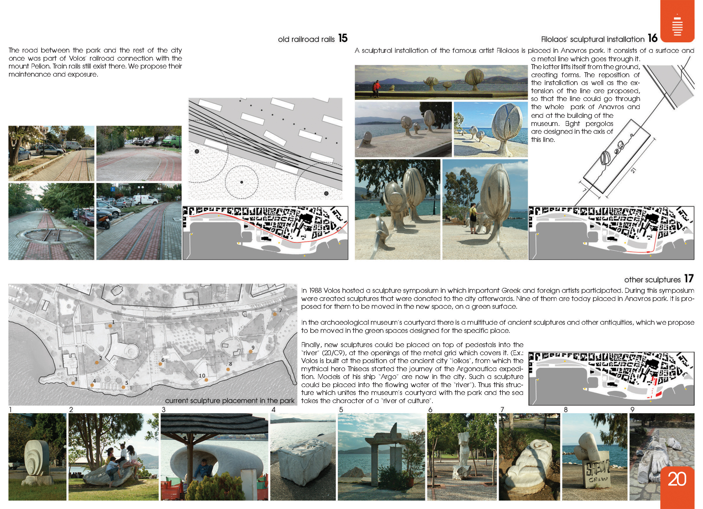 Τέλος νέα γλυπτά μπορούν να τοποθετηθούν πάνω σε βάθρα μέσα στο «ποτάμι» (C9) στα ανοίγματα που προσφέρει η μεταλλική σήτα που το καλύπτει. (Π.χ.: Ο Βόλος βρίσκεται στη θέση της αρχαίας πόλης Ιωλκού, από την οποία ο μυθικός ήρωας Θησέας ξεκίνησε το ταξίδι της αργοναυτικής εκστρατείας. Ομοιώματα του καραβιού του «Αργώ» βρίσκονται σήμερα στη πόλη. Ένα τέτοιο γλυπτό θα μπορούσε να τοποθετηθεί μέσα στο τρεχούμενο νερό του «ποταμιού»). Έτσι αυτή η κατασκευή που ενώνει τον χώρο του μουσείου με το πάρκο και τη θάλασσα παίρνει τον χαρακτήρα ενός «ποταμιού πολιτισμού».
