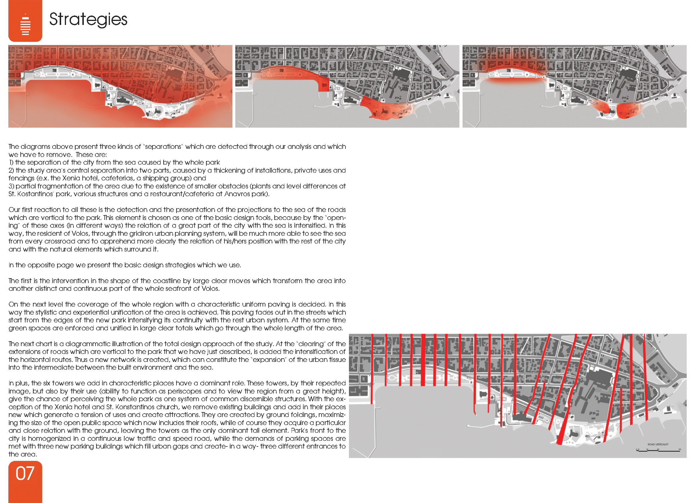 Απέναντι σε όλα αυτά μια πρώτη κίνηση είναι η ανίχνευση και παρουσίαση των προβολών στη θάλασσα των δρόμων που είναι κάθετοι στο πάρκο. Αυτό το δεδομένο επιλέγεται ως ένα από τα βασικά εργαλεία του σχεδιασμού, καθ’ ότι με τη «διάνοιξη» αυτών των αξόνων (με μια σειρά τρόπους) εντείνεται η σχέση με τη θάλασσα σε μεγάλο μέρος της πόλης. Πλέον ο κάτοικος του Βόλου, μέσω του ιπποδάμειου πολεοδομικού συστήματός, θα μπορεί με μεγαλύτερη ευκολία να βλέπει τη θάλασσα από κάθε σταυροδρόμι και να αντιλαμβάνεται πιο ξεκάθαρα τη σχέση της θέσης του με την υπόλοιπη πόλη και τα φυσικά στοιχεία που την περιβάλλουν.