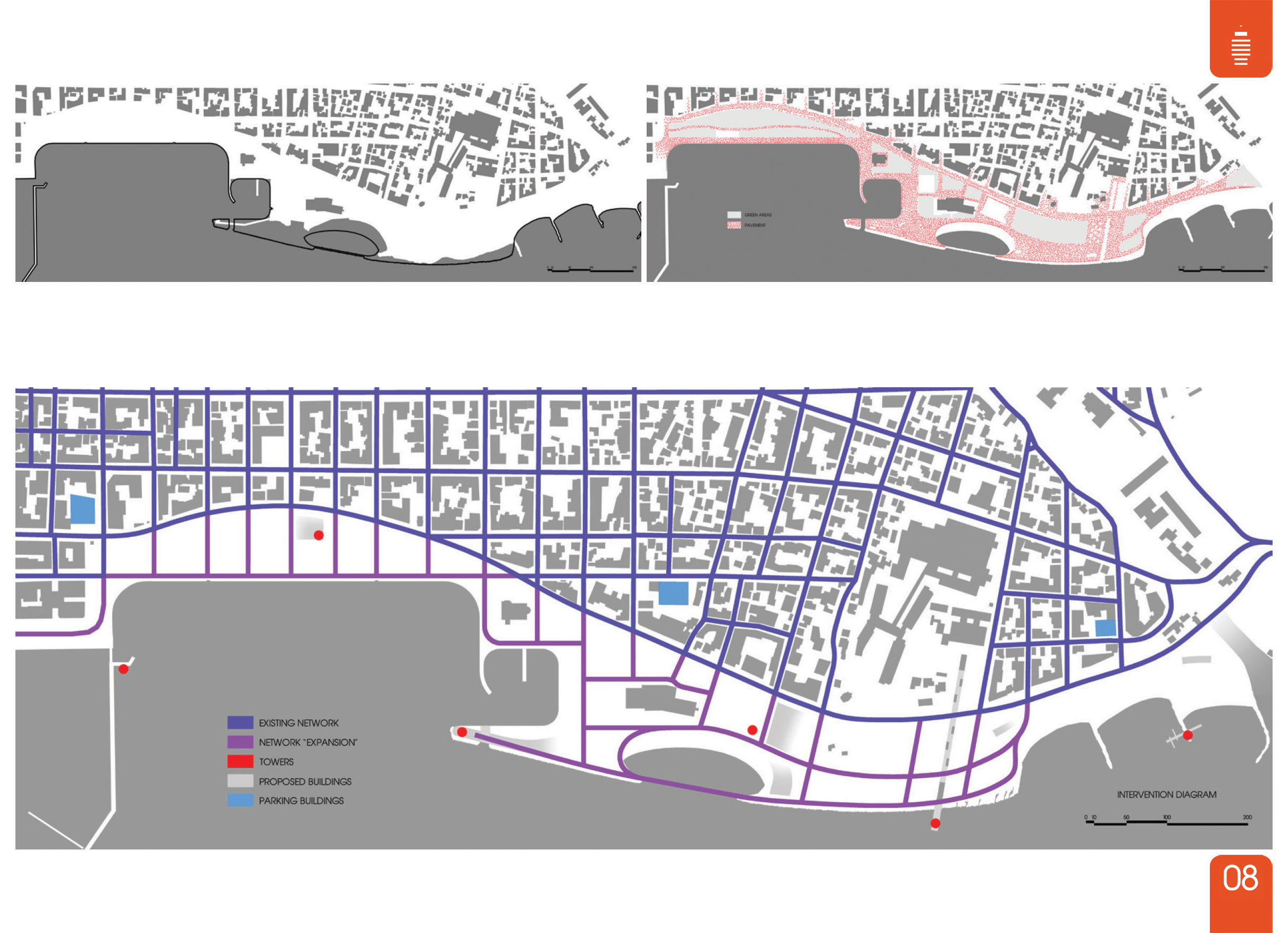 Το επόμενο διάγραμμα αποτελεί μια διαγραμματική απεικόνιση της συνολικής σχεδιαστικής προσέγγισης της εργασίας. Στην «εκκαθάριση» των προεκτάσεων των κάθετων στο πάρκο δρόμων, που περιγράψαμε μόλις προηγουμένως, προστίθεται η ένταση των οριζόντιων διαδρομών. Δημιουργείται έτσι ένα νέο δίκτυο, το οποίο μπορεί να αποτελέσει την «επέκταση» του αστικού ιστού στο ενδιάμεσο μεταξύ κτισμένου περιβάλλοντος και θάλασσας.