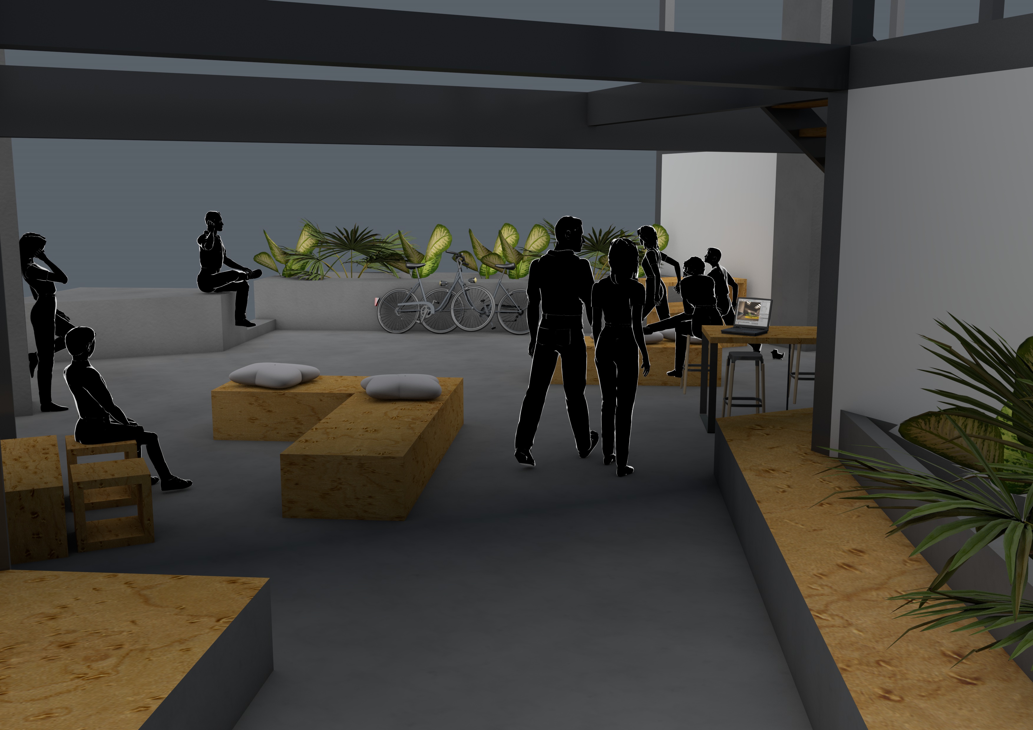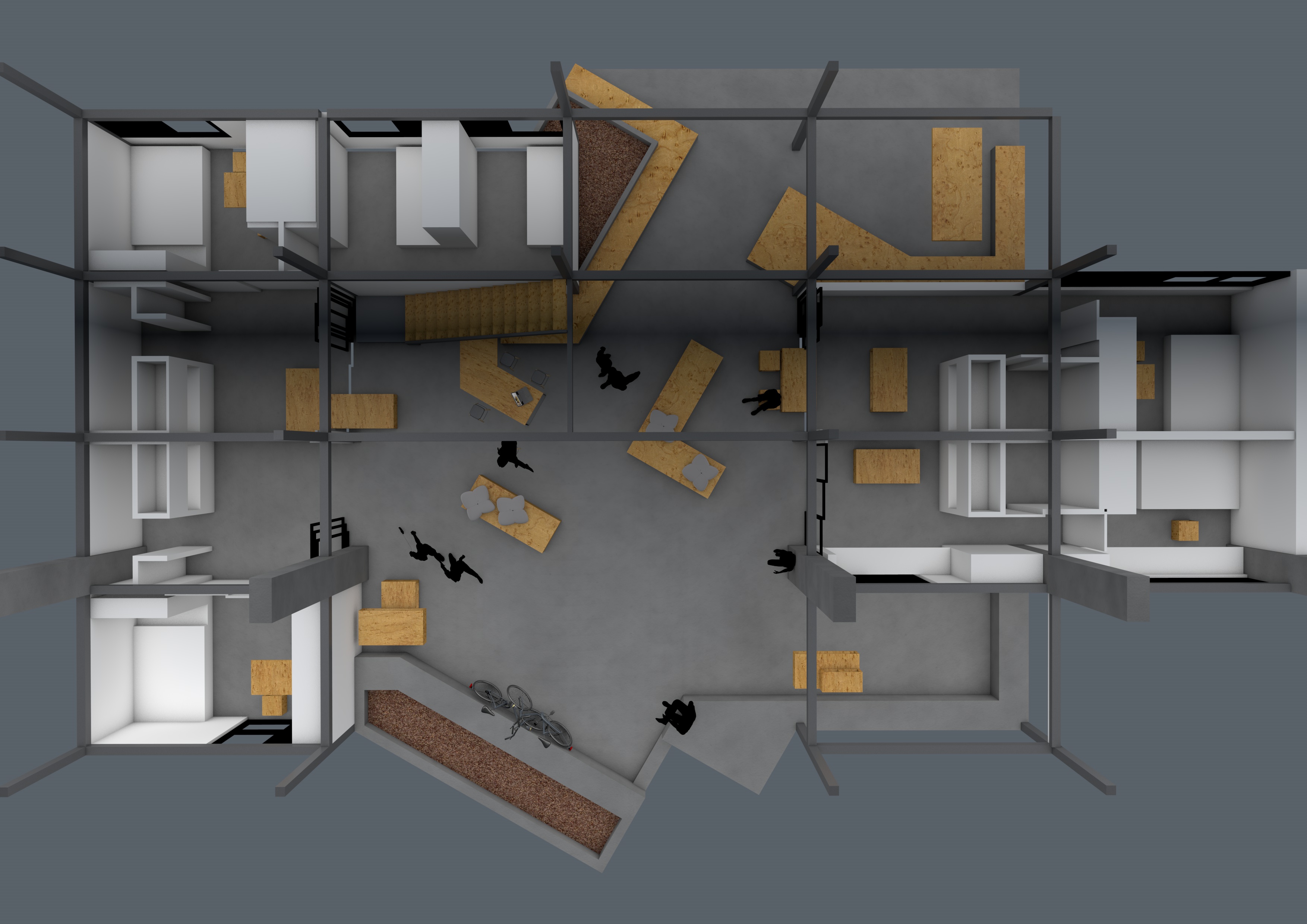 Το “κτίριο – κοινότητα” που επιδιώκουμε να φτιάξουμε, θέτει σε προτεραιότητα τη συλλογική ζωή στο κέλυφος και άρα τους κοινόχρηστους χώρους έναντι των ιδιωτικών, που ακολουθούν τη λογική του ελάχιστου. Ανάμεσα στα δυο δεν υπάρχουν σκληρά όρια, αλλά επιχειρείται μια ομαλή διαβάθμιση από το δημόσιο στο ιδιωτικό, με ενδιάμεσα επίπεδα και φίλτρα. Η ζωή στο κέλυφος οργανώνεται σε υποενότητες κατοικιών, γύρω από επιμέρους κοινόχρηστους πυρήνες και δίνεται η δυνατότητα επέκτασης των μονάδων κατοικίας με βάση τις ανάγκες των κατοίκων.