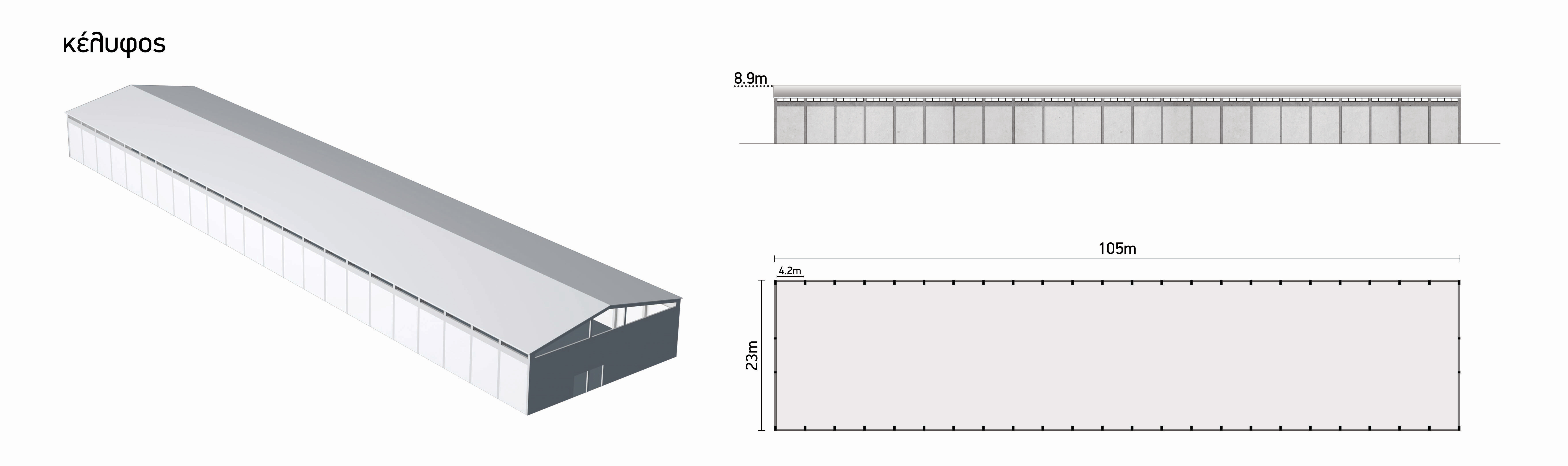 - στέγαση από μεταλλική αμφικλινή στέγη είτε από δώμα από οπλισμένο σκυρόδεμα.