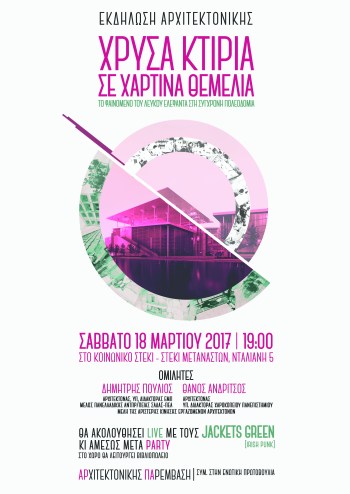 Η ΑΡχιτεκτονικής ΠΑρέμβαση (συμμετέχει στην Ενωτική Πρωτοβουλία), σχήμα ΕΑΑΚ στην Αρχιτεκτονική Χανίων, διοργανώνει το Σάββατο 18 Μάρτη 2017 στις 7.00 μ.μ. στο Κοινωνικό Στέκι – Στέκι Μεταναστών (Νταλιάνη 5) στα Χανιά εκδήλωση με τίτλο: «Χρυσά Κτίρια σε χάρτινα θεμέλια – Το φαινόμενο του λευκού ελέφαντα στη σύγχρονη πολεοδομία». Στην εκδήλωση θα εισηγηθούν ο Δημήτρης Πούλιος, Αρχιτέκτονας, Υπ. Διδάκτορας ΕΜΠ και ο Θάνος Ανδρίτσος, Αρχιτέκτονας, Υπ. Διδάκτορας Χαροκοπείου, μέλη της Πανελλαδικής Αντιπροσωπείας του ΣΑΔΑΣ-ΠΕΑ και της Αριστερής Κίνησης Εργαζομένων Αρχιτεκτόνων. Θα ακολουθήσει LIVE με το irish punk συγκρότημα Jackets Green κι αμέσως μετά πάρτυ, ενώ στο χώρο θα λειτουργεί και βιβλιοπωλείο.