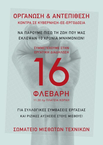 Το σωματείο μισθωτών τεχνικών καλεί στο συλλαλητήριο που οργανώνουν πρωτοβάθμια σωματεία του ιδιωτικού τομέα για το Σάββατο 16/02. Κύριες αιχμές της διαδήλωσης, αποτελούν το αίτημα για αυξήσεις στους μισθούς και τις αμοιβές μας με βάση τις εργατικές ανάγκες και η διαχρονική μάχη για τις Συλλογικές Συμβάσεις Εργασίας. Επίσης, στις βασικές αιχμές περιλαμβάνονται η πάλη ενάντια στις απολύσεις και στην εργοδοτική τρομοκρατία.