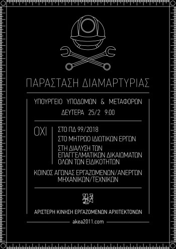 Την Δευτέρα 25 Φεβρουαρίου, στις 9:00πμ, πραγματοποιείται κινητοποίηση στο Υπουργείο Υποδομών και Μεταφορών (Αναστάσεως 2, Χολαργός, κοντά στη στάση «Εθνική Άμυνα» του μετρό) ενάντια στο ΠΔ 99/2018 και γενικότερα στο σχέδιο διάλυσης των επαγγελματικών δικαιωμάτων όλων των ειδικοτήτων των μηχανικών/τεχνικών.