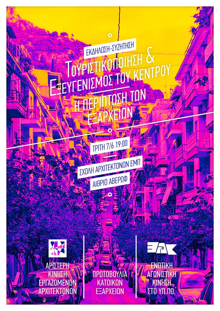 Την Τρίτη 7/6, στις 19:00, στο αίθριο της αρχιτεκτονικής (κτίριο Αβέρωφ) του Ε.Μ.Πολυτεχνείου στην Πατησίων, η Αριστερή Κίνηση Εργαζόμενων Αρχιτεκτόνων (ΑΚΕΑ), η Πρωτοβουλία Κατοίκων Εξαρχείων και η Ενωτική Αγωνιστική Κίνηση στο Υπουργείο Πολιτισμού, συνδιοργανώνουν εκδήλωση-συζήτηση με τίτλο «Τουριστικοποίηση και εξευγενισμός του κέντρου – Η περίπτωση των Εξαρχείων».