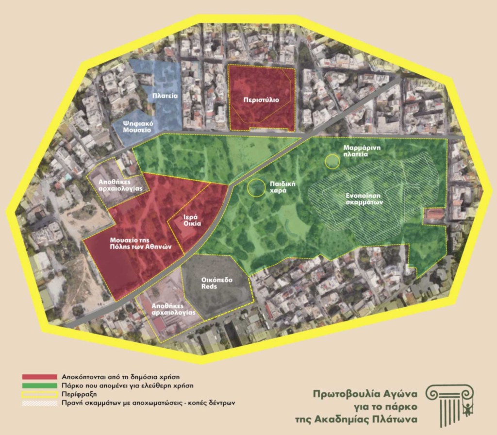 - Άμεση κατάργηση της συγκεκριμένης χωροθέτησης και ακύρωση του σχετικού αρχιτεκτονικού διαγωνισμού καταστροφής του ελεύθερου δημόσιου χώρου του Αρχαιολογικού Άλσους της Ακαδημίας Πλάτωνος.