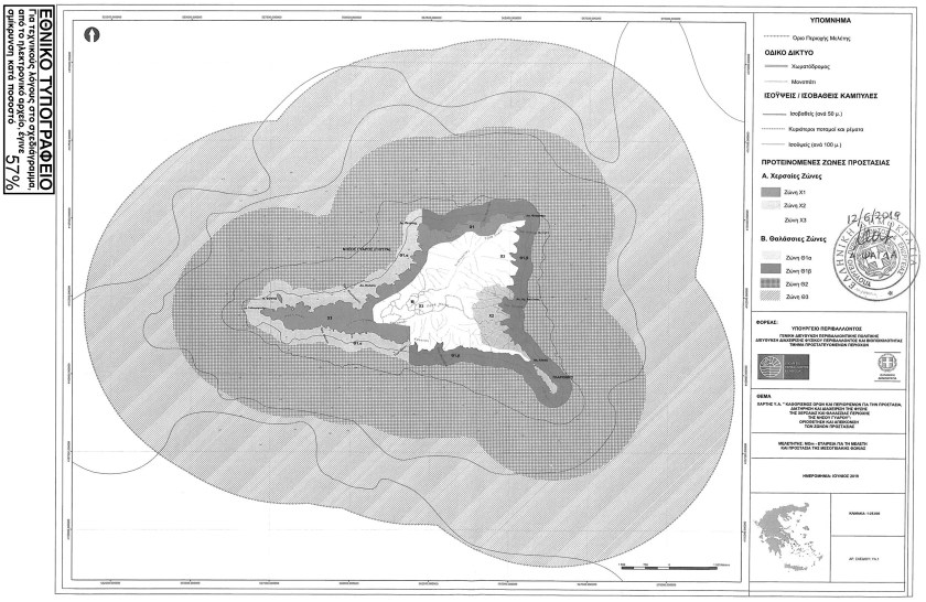 Οι προτάσεις του προγράμματος εγκρίθηκαν αλλά ουδέποτε υλοποιήθηκαν. Αντίθετα, το 2011, νέα Απόφαση του Υπουργείου Πολιτισμού (ΦΕΚ ΑΑΠ 182), αναοριοθετεί τον ιστορικό τόπο, αποχαρακτηρίζοντας το μεγαλύτερο μέρος του νησιού έξω από την περιοχή των πέντε όρμων, παρόλο που σύμφωνα με την §1 του άρθρου 12 του Ν.3028/2002 «οι αρχαιολογικοί χώροι κηρύσσονται και οριοθετούνται ή αναοριοθετούνται με βάση τα δεδομένα αρχαιολογικής έρευνας πεδίου» και τέτοια δεδομένα δεν προσκομίζονται.