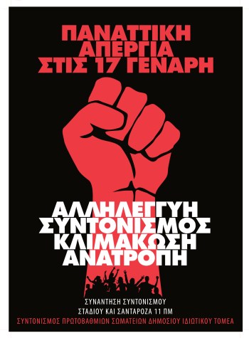 Το Σωματείο Μισθωτών Τεχνικών καλεί σε συμμετοχή στην παναττική απεργία την Τρίτη 17 Ιανουαρίου. Προσυγκέντρωση μαζί με τον Συντονισμό Πρωτοβάθμιων Σωματείων, Σταδίου και Σανταρόζα 11 π.μ.