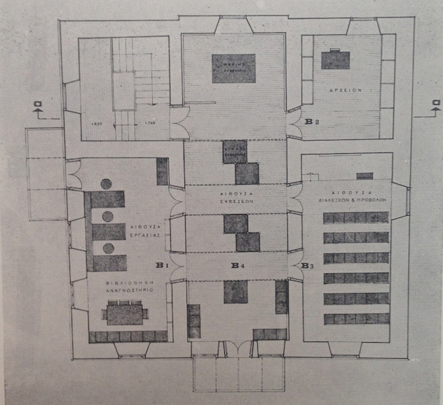 Δεύτερος όροφος: Λόγω της ελλείψεως των διαχωριστικών τοίχων και της υπάρξεως εις τούτον μεγάλων χώρων και δια λόγους αμέσου λειτουργίας του ξενώνος, οι χώροι πνευματικών δραστηριοτήτων, προεβλέφθησαν εις τον δεύτερον όροφον. Ο κεντρικός χώρος Β4, προβλέπεται χώρος εκθέσεων, ο Β1 λόγω θέας και ανέτου φωτισμού, ως χώρος εργασίας, σχεδιαστηρίου, βιβλιοθήκης και μικρών καθηστικών, ο Β3, ως αίθουσα συγκεντρώσεων, προβολών και διαλέξεων, και ο Β2, ως χώρος συλλογών και αρχείον.