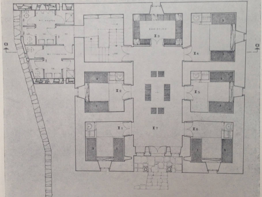 Ισόγειον: Ο κεντρικός χώρος εισόδου (Ι7) προβλέπεται ως υποδοχής και χώρος εκθεμάτων – είτε εργασιών και μελετών σπουδαστών, είτε μουσειακών αντικειμένων της τοπικής τέχνης. Οι χώροι Ι1, Ι2, Ι4, Ι5, Ι6 προβλέπονται ως κοιτώνες, των τριών κλινών. Ο χώρος Ι3 προβλέπεται ως εντευκτήριο (καθηστικό, ακρόασις μουσικής, αναγνωστήριο).