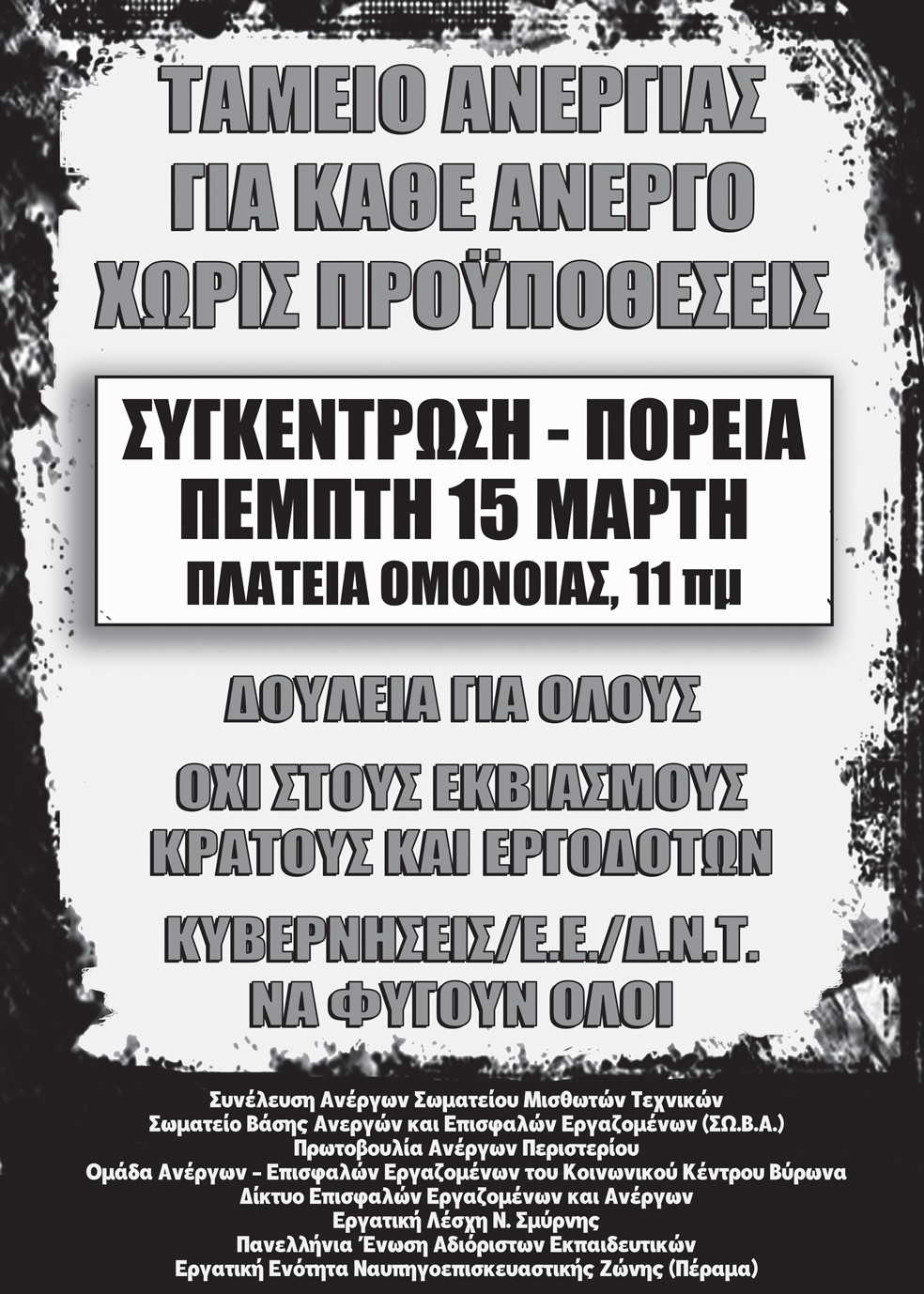 Την Πέμπτη 15 Μάρτη θα γίνει στις 11:00 πμ συγκέντρωση στην Ομόνοια ενάντια στην ανεργία και θα ακολουθήσει πορεία στο Υπουργείο Εργασίας. Η κινητοποίηση διοργανώνεται από την Πρωτοβουλία Ανέργων Περιστερίου, την Ανοιχτή Πρωτοβουλία Ανέργων (ΣΩ.Β.Α.), τη Συνέλευση Ανέργων Σωματείου Μισθωτών Τεχνικών, την Εργατική Λέσχη Νέας Σμύρνης, την ομάδα ανέργων – επισφαλώς εργαζομένων του κοινωνικού κέντρου Βύρωνα, το Δίκτυο Επισφαλώς Εργαζομένων ― Ανέργων, την Πανελλήνια Ένωση Αδιόριστων Εκπαιδευτικών (ΠΕΑΕ) και την Εργατική Ενότητα Ναυπηγοεπισκευαστικής Ζώνης Περάματος. Να είμαστε όλοι και όλες εκεί!