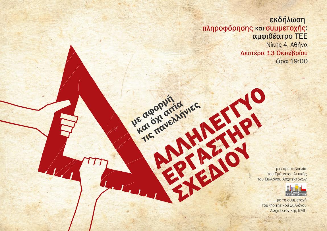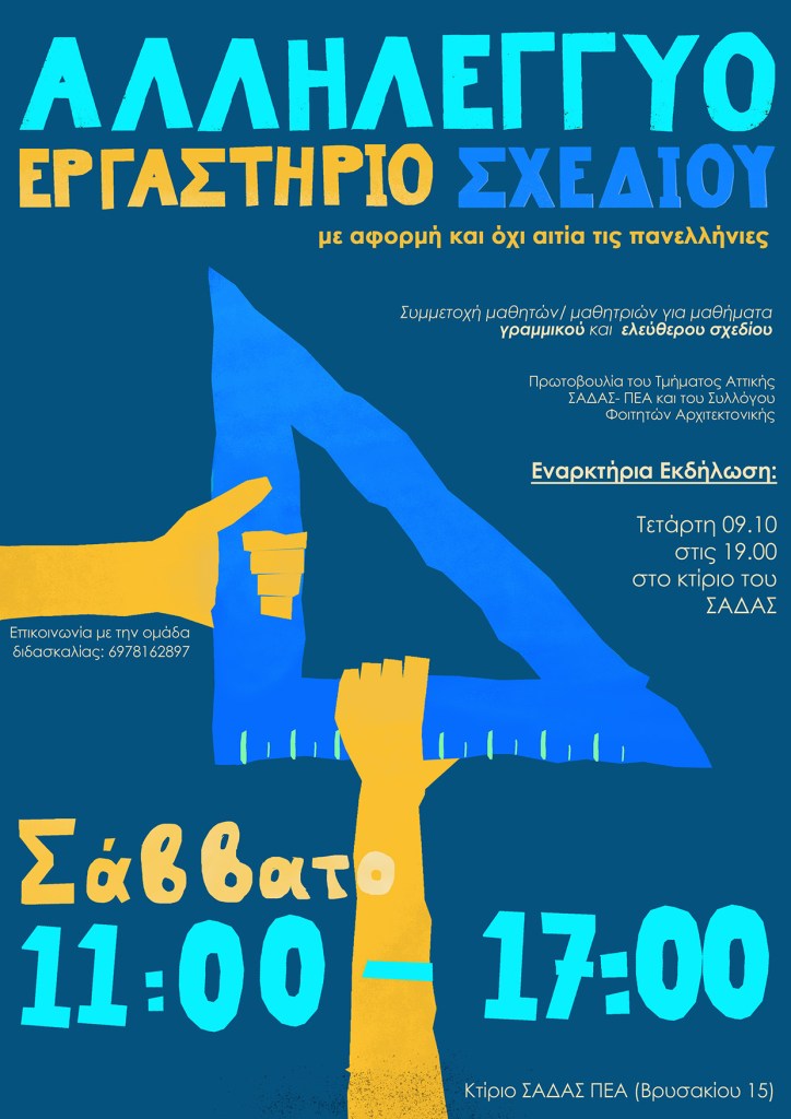 Το Τμήμα Αττικής του Συλλόγου Αρχιτεκτόνων (ΣΑΔΑΣ) σας καλεί στην εκδήλωση που θα γίνει την Πέμπτη 29 Σεπτεμβρίου στις 7μ.μ στο κτίριο του Συλλόγου (Κλάδου και Βρυσακίου 15, Μοναστηράκι), εκ μέρους του Αλληλέγγυου Εργαστηρίου Σχεδίου, το οποίο θα συνεχίσει για τέταρτη χρονιά την εκμάθηση γραμμικού και ελεύθερου σχεδίου, σε μαθητές που αδυνατούν να ανταπεξέλθουν οικονομικά στις ανάγκες των πανελληνίων, αφόσον δηλωθούν διαθεσιμότητες.
