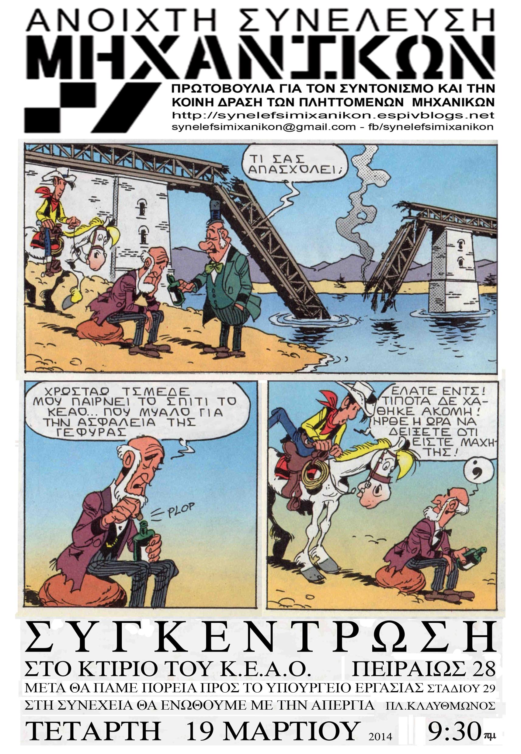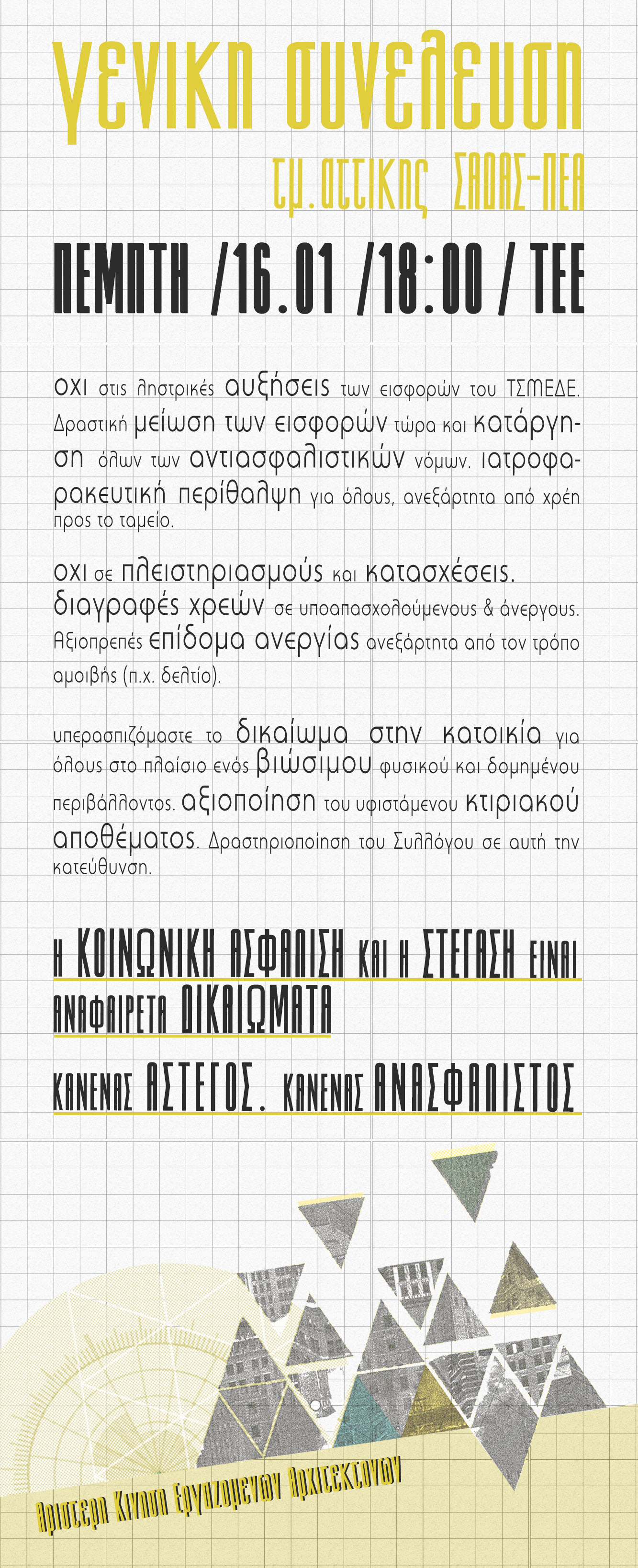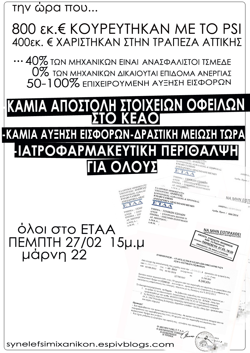 Την Παρασκευή 7 Δεκέμβρη θα πραγματοποιηθεί ανοιχτή συνέλευση μηχανικών για το ασφαλιστικό, στις 6μμ, στο αμφιθέατρο του ΤΕΕ (Νίκης 4). Επειδή η τεράστια αύξηση των εισφορών στο ΤΣΜΕΔΕ απειλεί να μας αφήσει όλους χωρίς ασφάλιση, περίθαλψη και επαγγελματικά δικαιώματα, η συμμετοχή όλων μας είναι πολύ σημαντική. Επειδή το ΤΕΕ ούτε θέλει ούτε μπορεί να οργανώσει κανέναν «αγώνα» για οτιδήποτε, η συγκρότηση ενός ανεξάρτητου κέντρου αγώνα που θα οργανώνει αμεσοδημοκρατικά τις κινητοποιήσεις των μηχανικών είναι προϋπόθεση για την ίδια την ύπαρξη συλλογικών κινήσεων ενάντια στην αύξηση των εισφορών. Ας είμαστε όλοι και όλες εκεί!