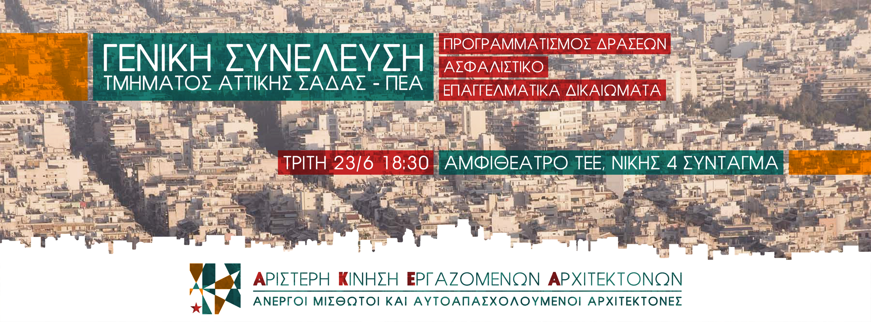 Σήμερα Τρίτη, 23/6/2015, ώρα 6:30μμ, στο Αμφιθέατρο του ΤΕΕ (Νίκης 4, Σύνταγμα, 1ος όροφος), θα γίνει Γενική Συνέλευση του Τμήματος Αττικής του ΣΑΔΑΣ-ΠΕΑ με θέματα ημερήσιας διάταξης: