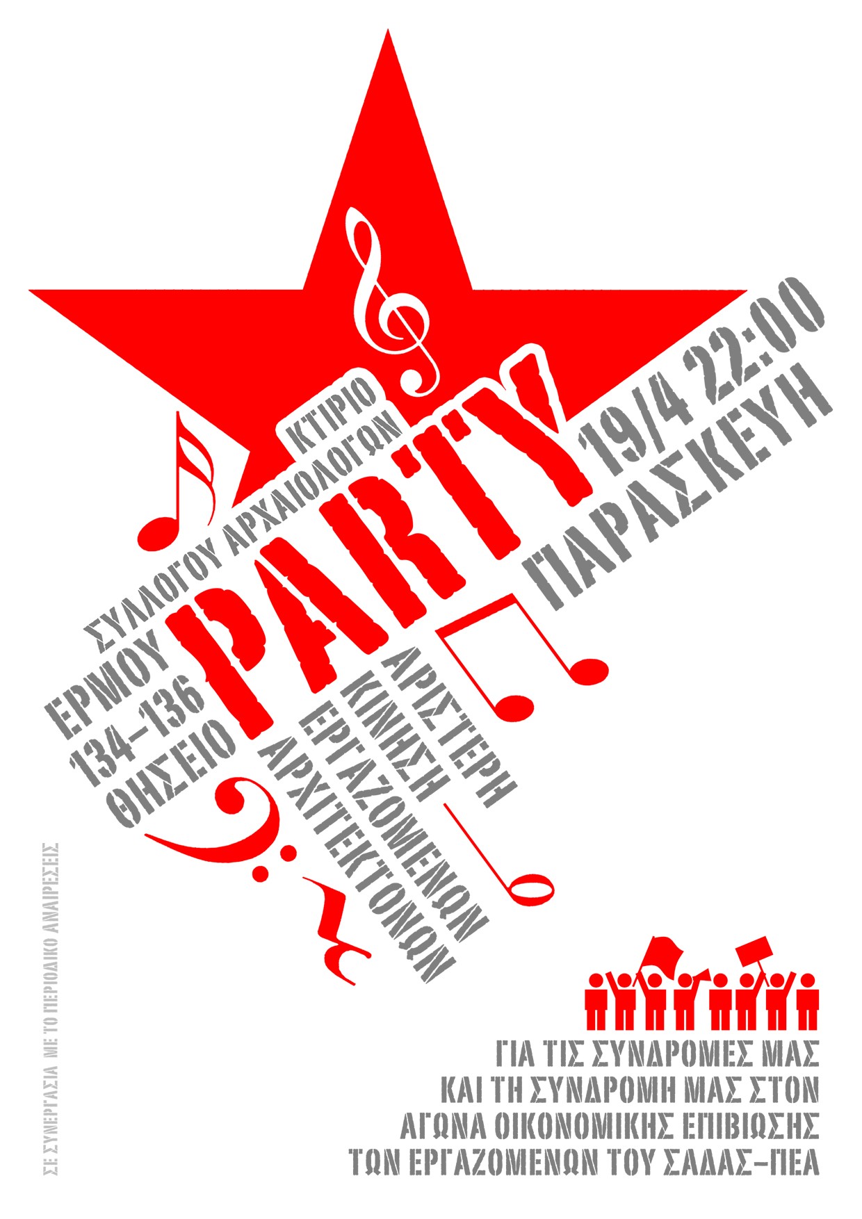 Το Σωματείο Μισθωτών Τεχνικών μετακόμισε σε νέα, μεγαλύτερα γραφεία και σας καλεί στο πάρτυ των εγκαινίων. Τα νέα γραφεία βρίσκονται στο Σύνταγμα, Ερμού και Φωκίωνος 11, στον τέταρτο όροφο. Θα υπάρχει προαιρετική είσοδος 2€ για την ενίσχυση του Σωματείου.